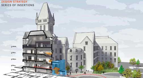 ![]() Design images: © Deborah Berke and Partners Architects LLC Inside the entranceway will be a stairway that will take visitors to the main floor of the hotel lobby. ![]() Design images: © Deborah Berke and Partners Architects LLC This was the easiest way to solve the conundrum that the corporation faced when they learned that the rear entranceway of the building was actually much lower that than the front entranceway (where hotel services will be located). ![]() Design images: © Deborah Berke and Partners Architects LLC ![]() Design images: © Deborah Berke and Partners Architects LLC ![]() Design images: © Deborah Berke and Partners Architects LLC ![]() ![]() ![]() Design images: © Deborah Berke and Partners Architects LLC Moving back out to the exterior of the building, an ugly elevator shaft (added much later in the life of the asylum) will be removed, thankfully. The grounds continue to unfold nicely, with rain gardens and pedestrian bridges, walkways, benches, lighting and patio-like drop-off areas for visitors. The design team is comprised of executive architect Flynn Battaglia Architects of Buffalo and design architect Deborah Berke Partners of New York. Additional members of the team include Boston-based historic preservation firm Goody Clancy; Andropogon Associates, a Philadelphia-based landscape architecture firm; LP Ciminelli, a construction management firm from Buffalo. |