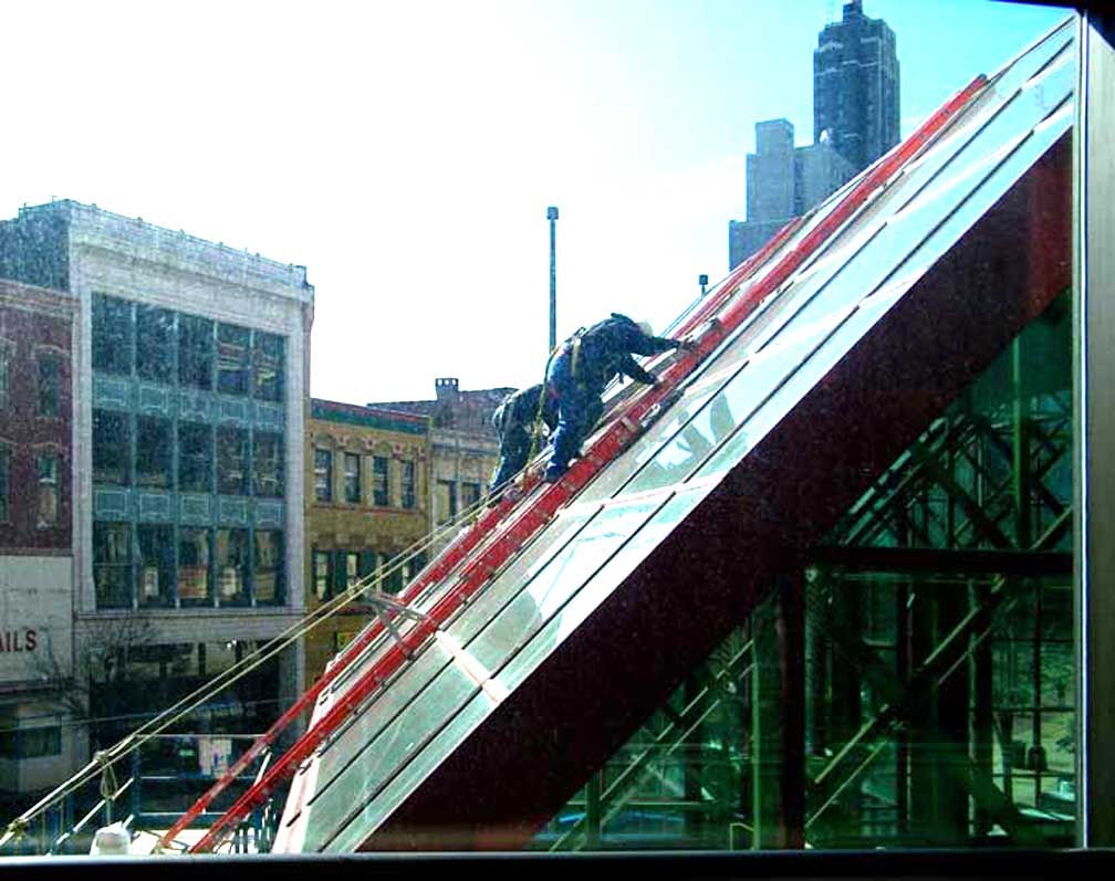 Exterior![]() Flanking glass pavilion (atrium) - in Postmodern style - is a 1984 addition to the former Genesee Building at right Left: Berger's Department Store/Belesario Apts. ![]() Tall building in background: Rand Building ![]() Window washers at work |