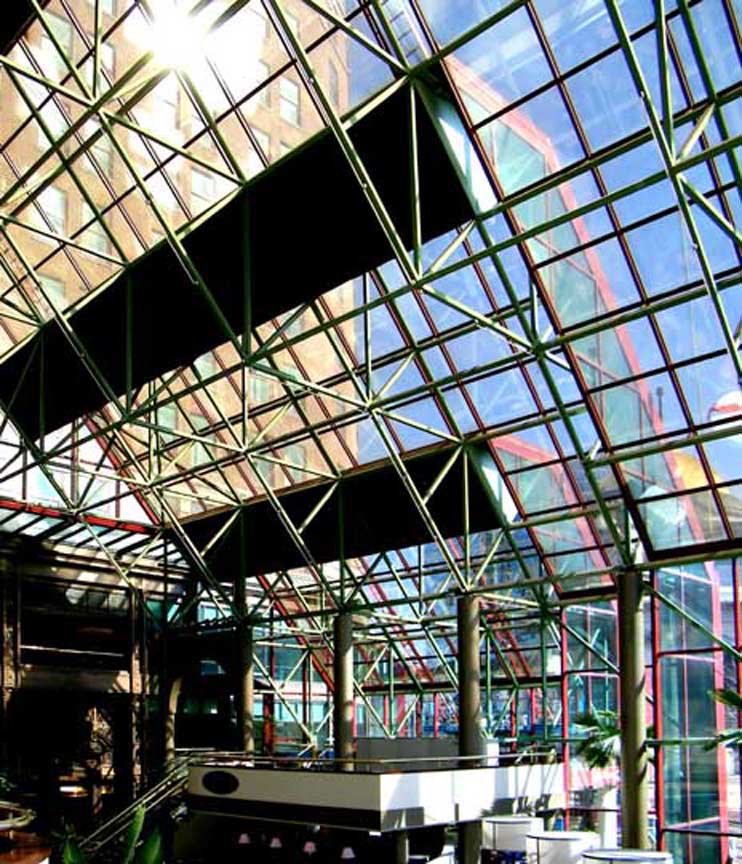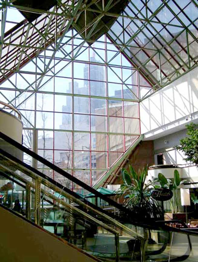 Restaurant and Lounge ![]() Main floor restaurant Mezzanine lounge at left ![]() View of the restaurant from the mezzanine ![]() Restaurant glass wall ![]() Escalator to mezzanine ![]() Mezzanine lounge ![]() Mezzanine lounge ![]() View of the restaurant glass wall from the mezzanine lounge |