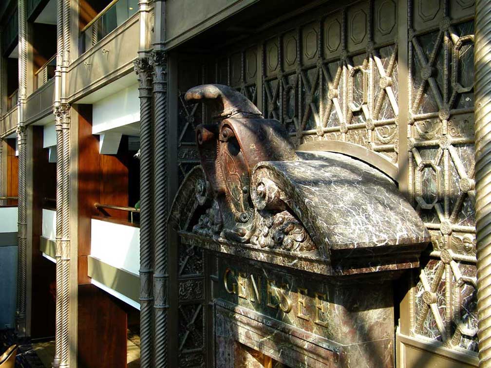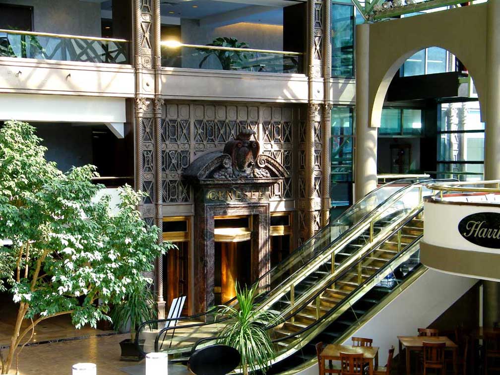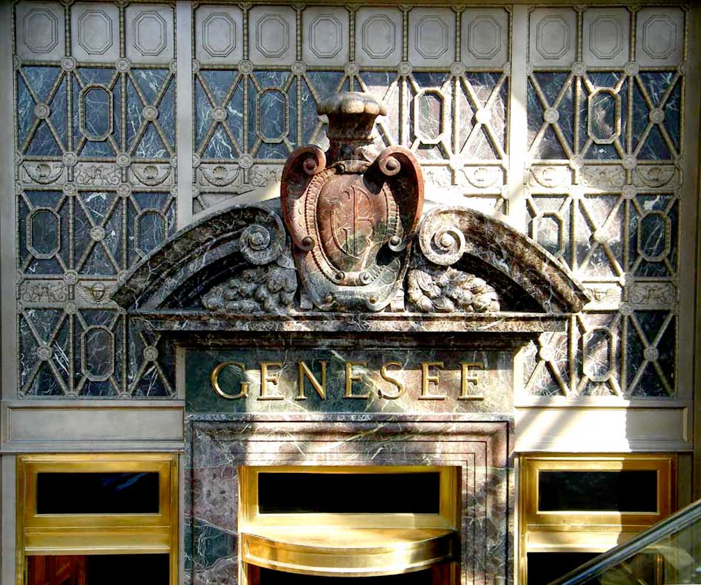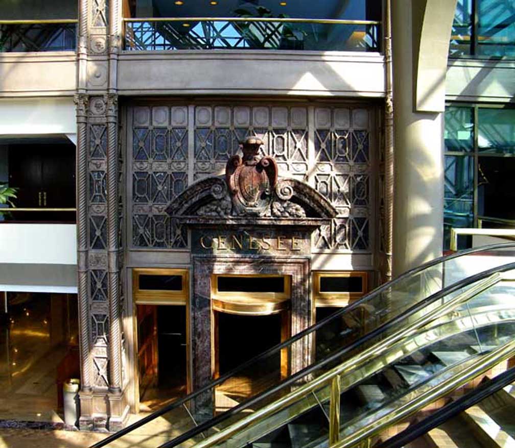 Genesee Building Facade ![]() Genesee Building facade transformed into an interior wall with the glass addition of the arium which served as a restaurant and mezzanine lounge ![]() Original Genesee Building entrance on Genesee Street Details below: ![]() Original Genesee Building entrance Cast iron ![]() Broken pediment with cartouche C scrolls ![]() ![]() Original Genesee Building entrance seen from behind the elevator to the mezzanine level Note flanking twisted cast iron columns ![]() Ionic style twisted cast iron columns Note putto ![]() Grotesque ![]() Basket with scrolling acanthus leaves ![]() Griffins |