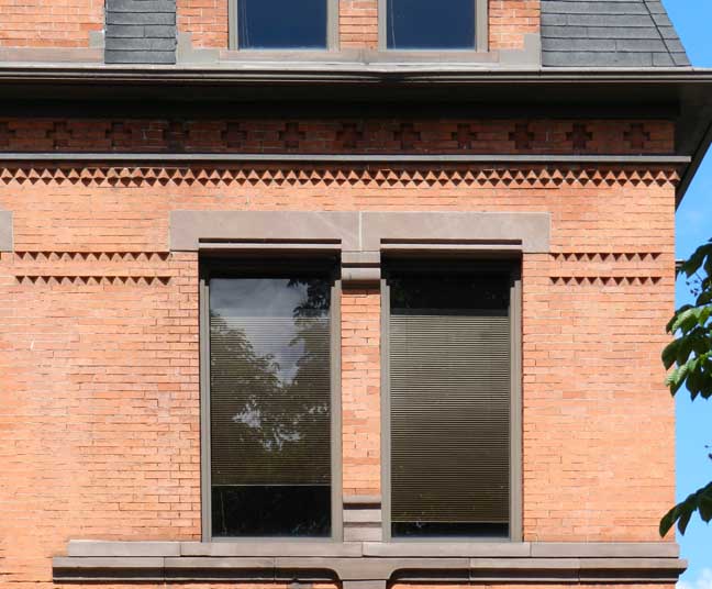 Façade![]() Second Empire ... Erected: C. 1877 ![]() Straight Mansard roofs ... Sawtooth course ... Brick ![]() Arches: Trefoil ... Round, with keystone ... Segmental ![]() Trefoil arch ![]() ![]() Cross motif in frieze ... Sawtooth course ![]() Cross motif in frieze ... Sawtooth course ![]() Segmental arches ... Floor-to-ceiling Second Empire windows ![]() ![]() Second Empire double doors ![]() ![]() |