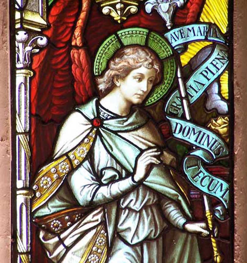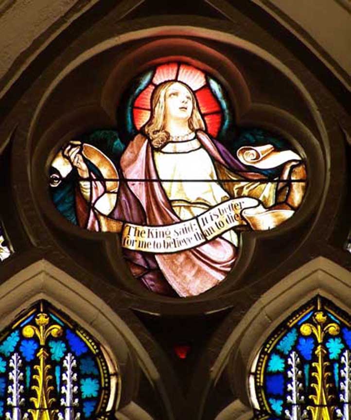 St. Patrick - detail                    Angels in quatrefoils at the top of each nave window hold scrolls relating to the message below