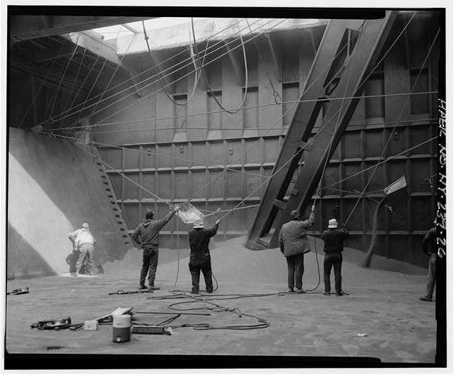 Grain off-loading procedure, workmen using