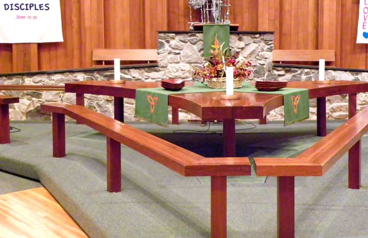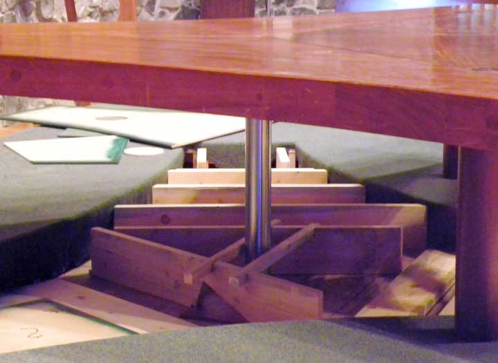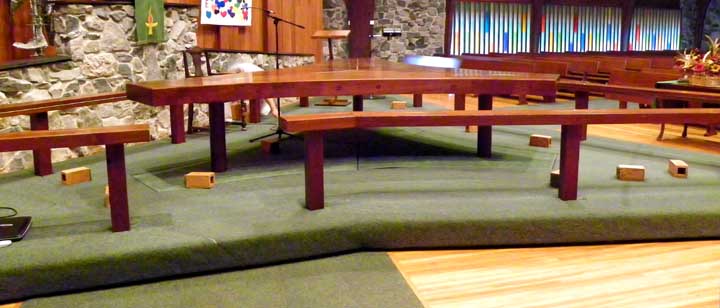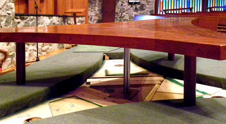 ![]() Note the triangular cut-out carpet, under which the communion table is stored. The triangular table symbolically represents the Trinity, part of the name of this church. Note air pressure condenser at left which is the power source for raising and lowering the communion table. ![]() The carpet has been removed and the communion table raised on on the center retractable metal post. Note the labeled wooden pieces which will be assembled to support the now removed carpet. The table is 6" solid African mahogany. ![]() Carpet supports being assembled. ![]() Metal post has been retracted; carpet hs been laid under the communion table. Altar rails have been carried to the chancel and dropped into predrilled holes. Note the carpeted wooden blocks that are lying about: they filled the holes when the communion table was stored beneath the floor. ![]() Communion table and altar rails are ready for Sunday service! |