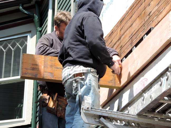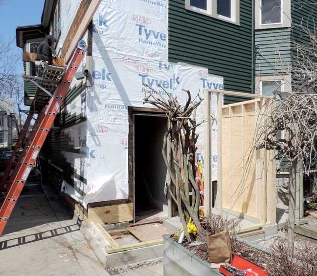 Contractors constructing the second bay which will be a passageway between the elevator and the house.