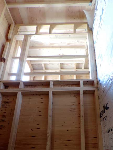 Inside the elevator shaft which was added to the rear of the house ... On the second floor, passengers will exit the elevator into the the driveway bay which will be a passageway between the elevator and house.