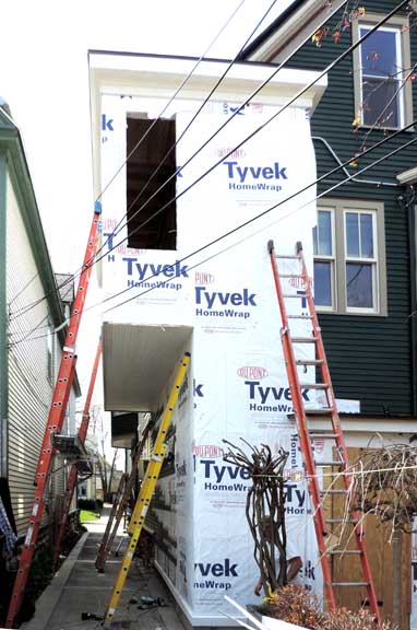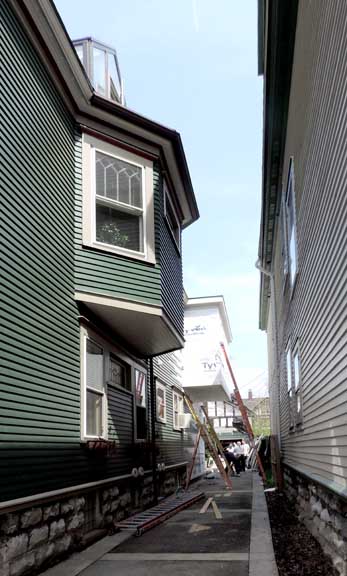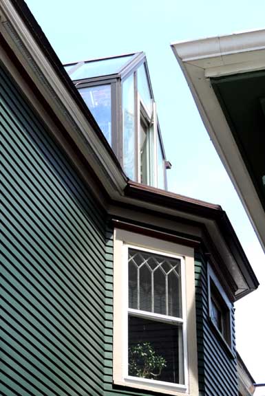 A second bay is being constructed to be used as an interior walkway between a new elevator in the rear and the house ... Note the attic greenhouse (also below:).