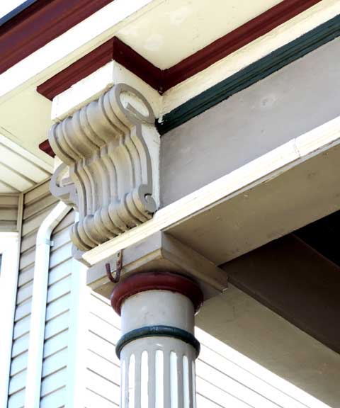 Fanciful ancone at end of frieze ... Fluted Tuscan Revival column.