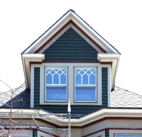Dog-house dormer features broken pediment and wooden traceried sash windows