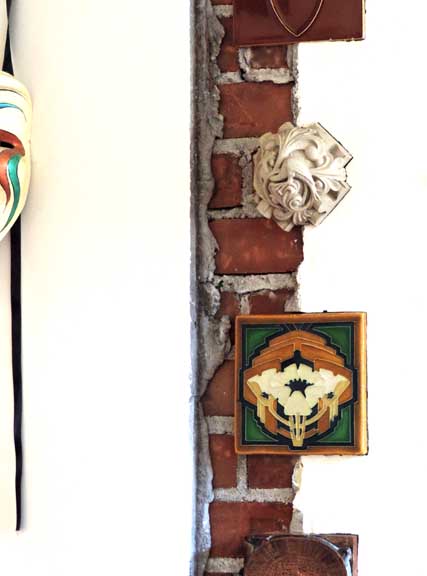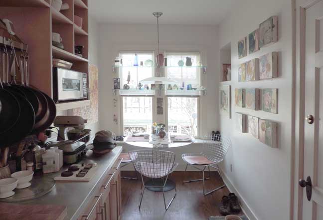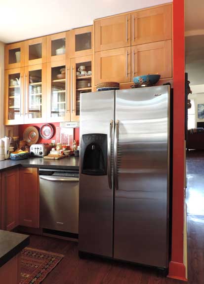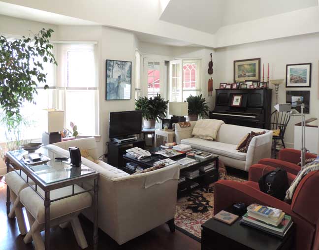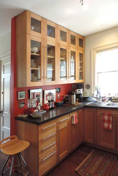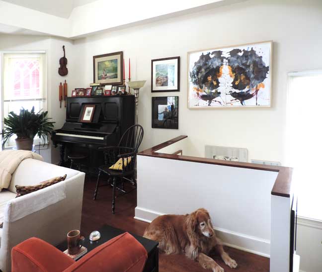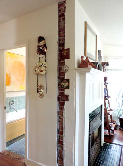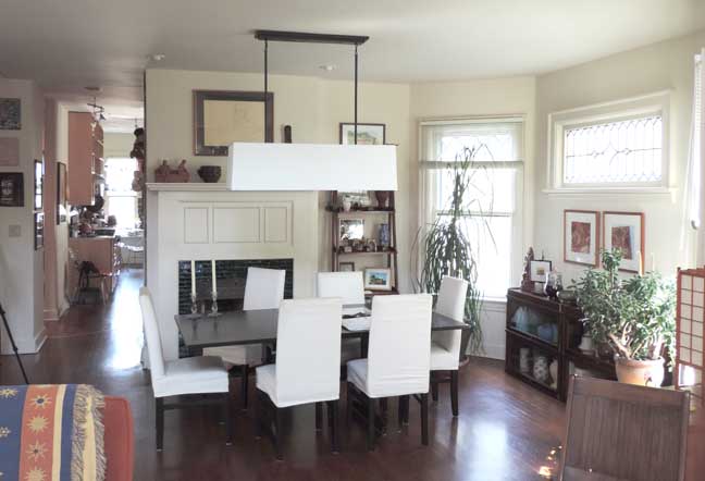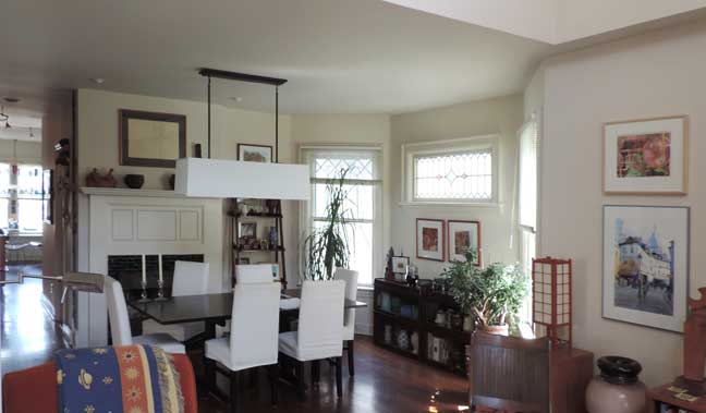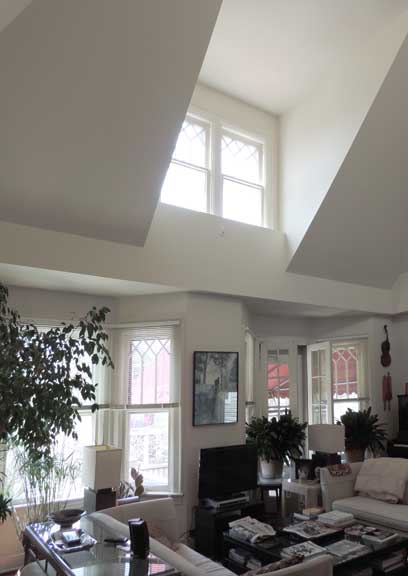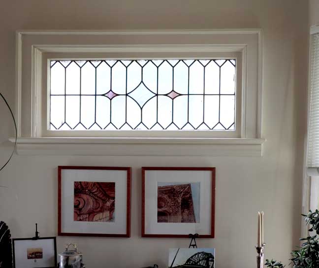 Long time owner and professional interior designer Thomas Palamuso, made substantial changes in this living room ... Weight bearing column is anchored in the basement ... Living room ceiling was removed and opened up to finished attic creating a "cathedral ceiling" (next photo below:) ![]() Second floor living room ... Living room ceiling removed ... Large attic dormer provides an abundance of light ![]() Living room opens into dining room ![]() Additional light provided by generous size Queen Anne style bay windows with wooden tracery ![]() Wooden tracery ![]() ![]() Josie lies next to the front stairs. ![]() Second floor dining room ![]() Behind dining room are bathroom, bedroom and kitchen ... At right in photo is a window that features stained glass (shown below:) ![]() ![]() Lead cames ... Opalescent stained glass ![]() Dining room fireplace ![]() Fireplace ornamental molding: egg-and-dart ![]() Cast iron fireplace ...Glazed brick surround and hearth ![]() Top row: shell flanked by cornucopia ... Row of anthemions ... Row of egg-and-dart ... Row of scrolling acanthus leaves ![]() ![]() Cherry and maple circular staircase to attic constructed by Tom Palamuso over a 5 1/2 month period in the living room ![]() Cherry steps with maple supports ... Mortise and tenon construction - no nails ![]() ![]() ![]() Exposed brick delineates the end of the first phase of the remodeling process. All work beyond this point was designed by both Carol and Tom. ![]() Keepsakes: top ornament is a boss ![]() Redesigned kitchen by Carol and Tom included substituting kitchen and pantry for a bedroom ... When the outdoor elevator is finished, entry from the raised driveway walkway will be into the kitchen. ![]() ![]() ![]() Breakfast nook overlooks the backyard ... Photos below are of the finished attic. |