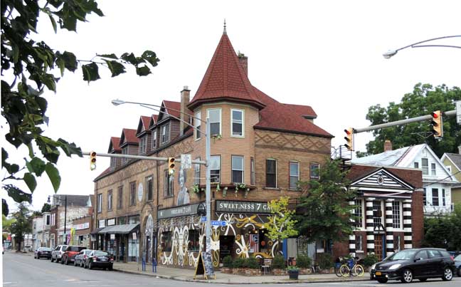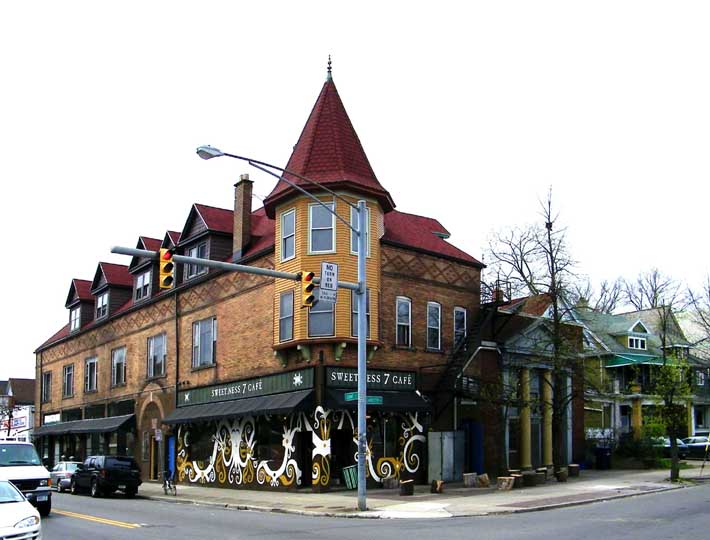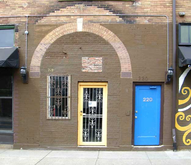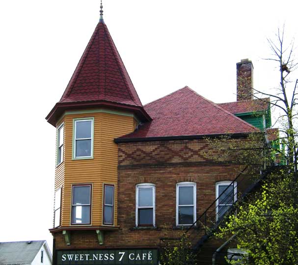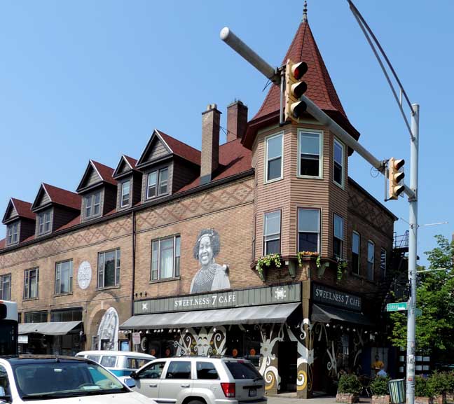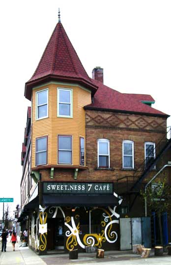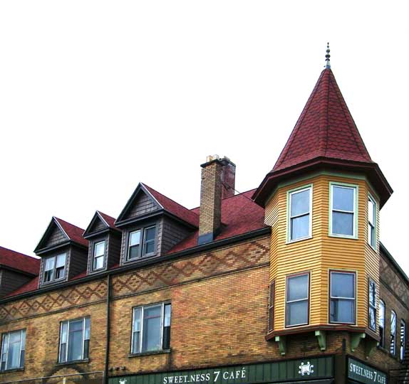 2009 photos![]() 2009 photo ... Southwest corner. Queen Anne style: Corbel-supported corner turret topped by hexagonal roof with finial ... Pedimented dormers ... Former church to the right was built in 1920 by Rev. Billy Sunday ![]() 2009 photo ... West elevation ... ![]() 2009 photo ... West elevation. Art work by Prish Moran (Sweet_Ness 7 Café owner). According to Moran, the image is the Burmese God of Happiness, and Burmese (Myanmar) immigrants touch the image for good luck. ![]() 2009 photo ... West elevation. Mum's and Daisy's floral shop ... In the 2014 photo below, Global Villages has replaced the flower shop. ![]() 2009 photo ... West elevation. Arch features keystone and brick voussoirs. In 2014 photo below, a wheat-pasted photograph of Prish Moran covers this area. ![]() 2009 photo ... North (Lafayette Avenue) elevation ![]() 2009 photo ... North elevation. ![]() 2009 photo ... North elevation. Art work by Prish Moran: the God of Happiness |