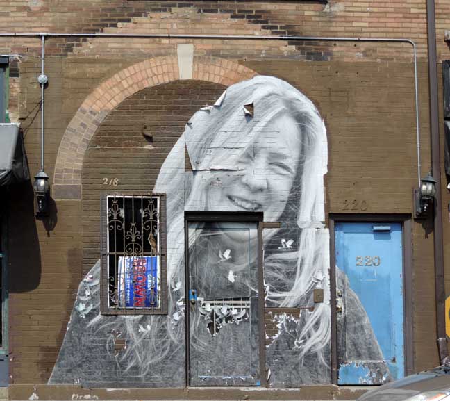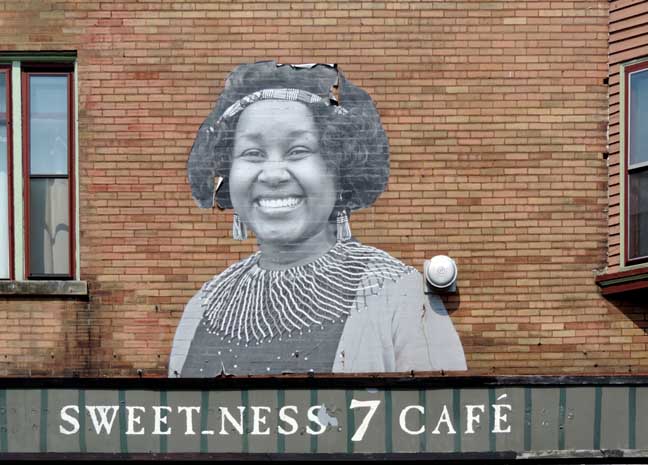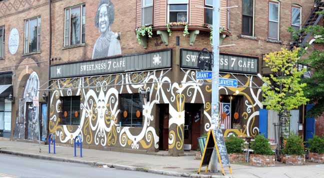 2014 photos![]() SW corner Grant and Lafayette ![]() 2014 photo ![]() 2014 photo ... Sweet_Ness 7 owner Prish Moran. Wheat-pasted photo by Max Collins in 2012. See also: Video - Making "Freestyle Faces of Main Street" ArtVoice on 07/31/2012 features Max Collins (online June 2014) ![]() 2014 photo. Global Village owner Louise Sano, a recent immigrant from Rwanda. Wheat-pasted photo by Max Collins in 2012. ![]() 2014 photo. Art work by Prish Moran (Sweet_Ness 7 Café owner). According to Moran, the image is the Burmese God of Happiness, and Burmese (Myanmar) immigrants touch the image for good luck. ![]() ![]() Note trellis at far right (2 photos below:) ![]() ![]() |