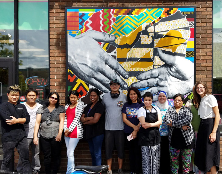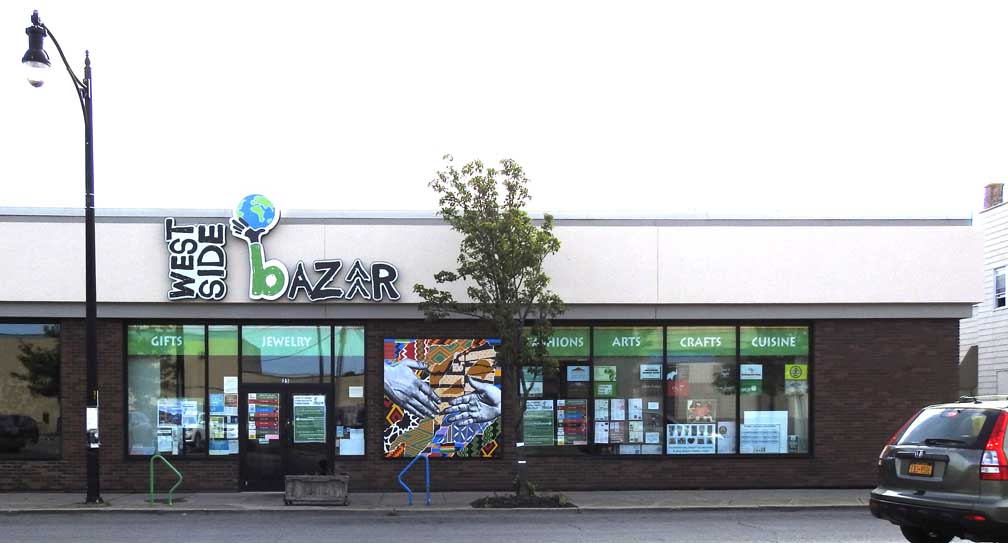 Partial reprint Weaving the Colors of the World: A Celebration of Buffalo’s Diversity Through Public Art Buffalo Rising, August 2, 2017 (online September 2020) ![]() Muralist Chuck Tingley in center It [Weaving the Colors of the World mural] represents the diversity that is found inside the building, as well as throughout the West Side. The work features textile patterns from around the globe, representing many of the ethnic cultures that have come to call Buffalo “home”. The colorful fabrics and traditional prints painted in the mural reflect the clothing worn by men and women who hail from Burma (Myanmar) and Somalia, for example. The mural recognizes these new refugees that have managed to create new lives for themselves despite all of the hardships that have come their way. |
