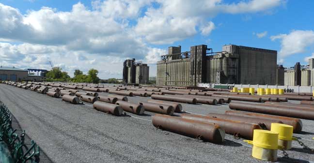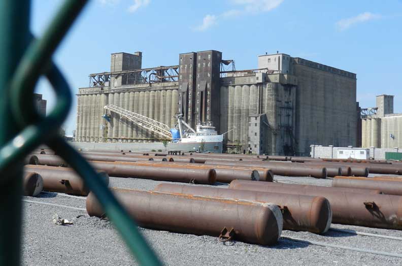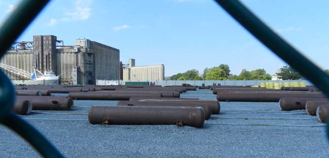 ![]() Center background: Marine A Elevator To the right of Marine A: Lake & Rail Elevator Far right elevator: ADM Standard Elevator ![]() Looking through the chain link fence. Wall behind the booms separates this storage area from Mutual Riverfront Park. ![]() Looking through the chain link fence ... Lake & Rail Grain Elevator in center background .. Far left is ADM Standard Elevator |