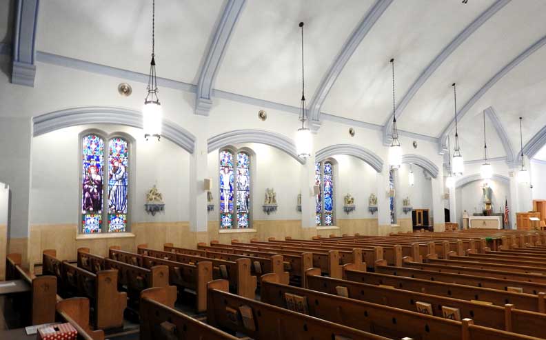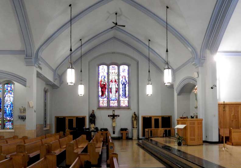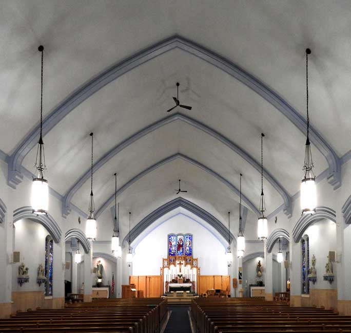 Sanctuary and nave ... Gothic Revival ribs ... Main altar flanked by two chapel altars ... Pews