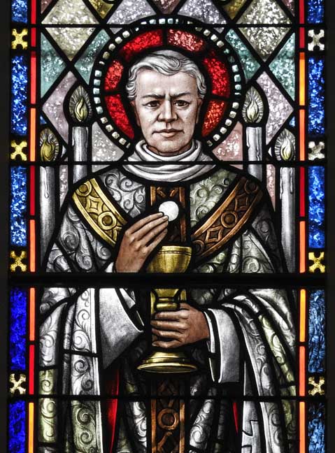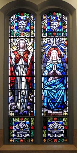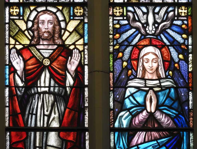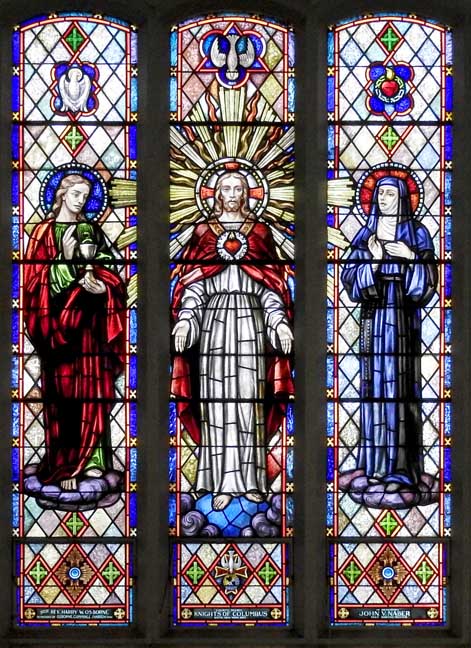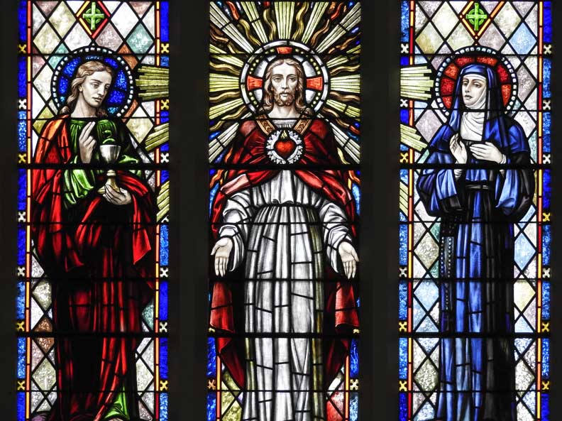 Left panel: St. John the apostle, traditionally depicted beardless, holding Holy Communion ... Center panel: Jesus displays his sacred heart to a nun, St. Margaret Mary Alacoque (third panel), the saint after whom this church is named ... Two window details below: