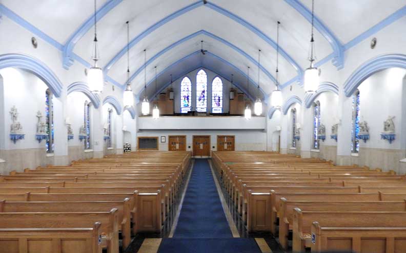 Nave and choir loft ... View from the altar ... Stained glass windows in the choir loft detailed below: