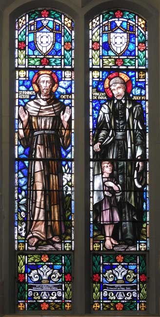 Note the two stigmata on the hands of St. Francis of Assisi, the first saint to receive the stigmata ... Cf., the statue of stigmatist Padre Pio on the front lawn of the church ... The two dates are the feast days of the saints, although St. Vincent's feast day since 1970 is September 27 ... Detail below illustrates the bottom of the St. Francis panel: