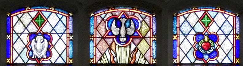 Left panel: Eagle is a symbol of St. John the apostle ... Center panel: Holy Spirit in the form of a dove above Jesus - two of the three Persons in the Trinity ... Right panel: the sacred heart of Jesus