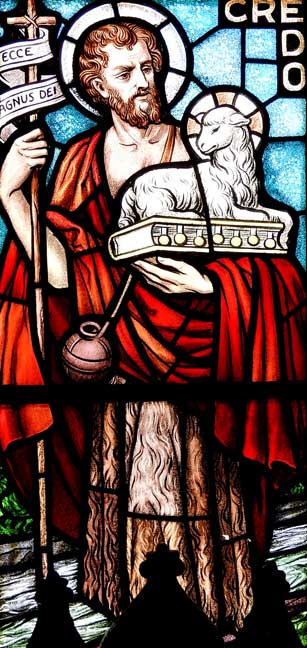 Stained glass window by Josef Mazur ... St. John the Baptist holding the Lamb of God, i.e., Jesus ... "Credo": "I believe" ... "Ecce Agnus Dei": "Behold the Lamb of God" ... The window is not related to Padre Pio