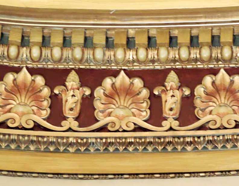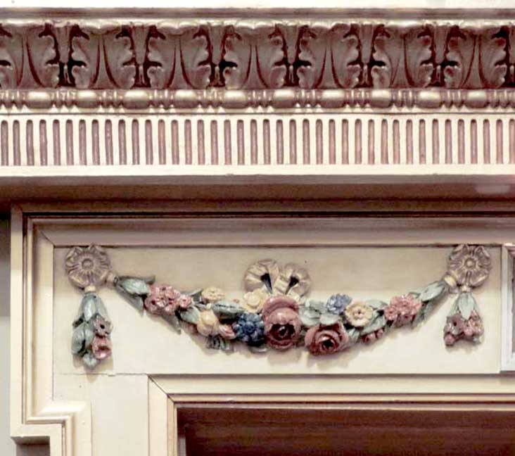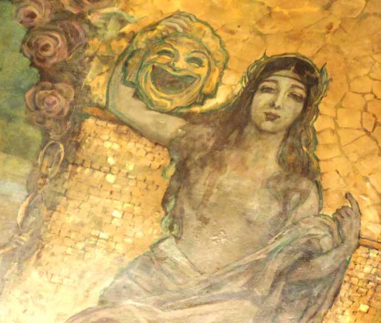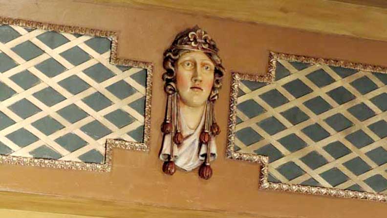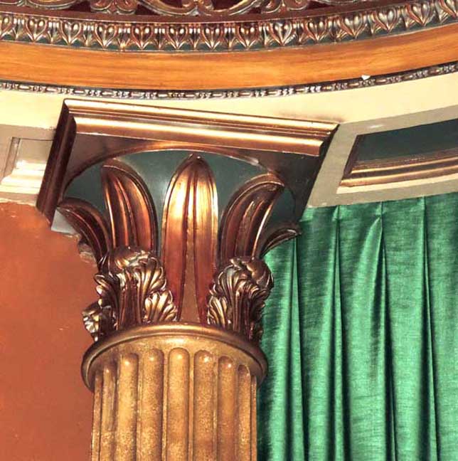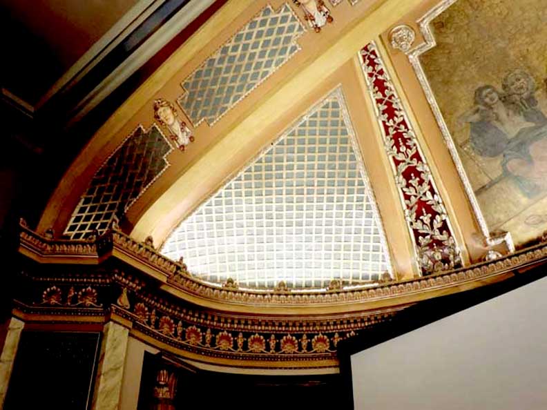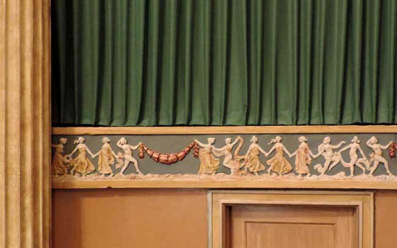 The Stage ![]() Stage featuring oval dome ![]() Side of the stage ... Three stenciled panel details below: ![]() Detail #1 ... Stenciled panel ![]() Detail #2 ... Stenciled pattern below: ![]() Detail #2 ... Stenciled pattern ![]() Cloth reinforced plaster classical figures ![]() Capital with two types of acanthus leaves ![]() Three details below: ![]() Detail #1 ... Cloth reinforced plaster ornamentation ![]() Detail #2 ... Dentils (top) ... Egg-and-dart ... Bead-and-reel ... Anthemia ... Leaf-and-dart ![]() Detail #3 ![]() Painting by Raphael Beck ... Six details of the top classical plaster faces and mural below: ![]() Detail #1 ![]() Detail #2 ... Melpomene, the Greek muse of tragedy, holding her stage mask ![]() Detail #3 ![]() Detail #4 ![]() Detail #5 ... ![]() Detail #6 ... Thalia, the muse of comedy, holding her stage mask. |