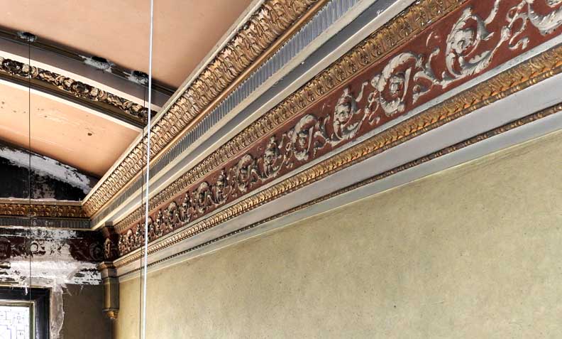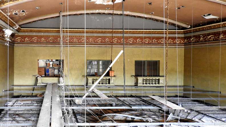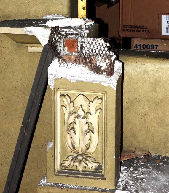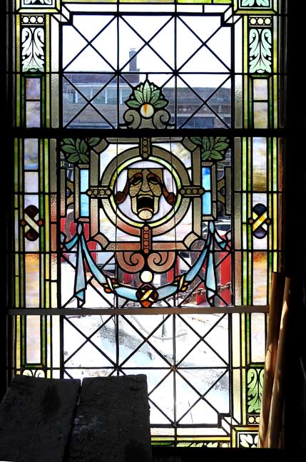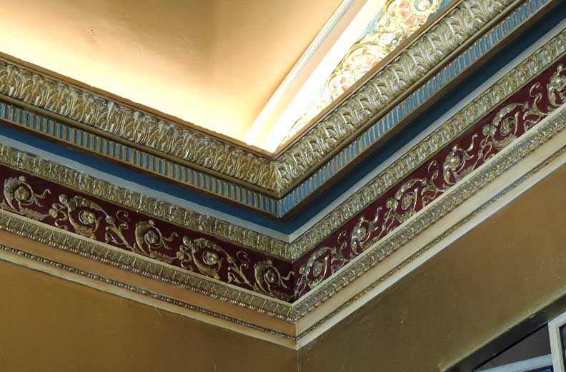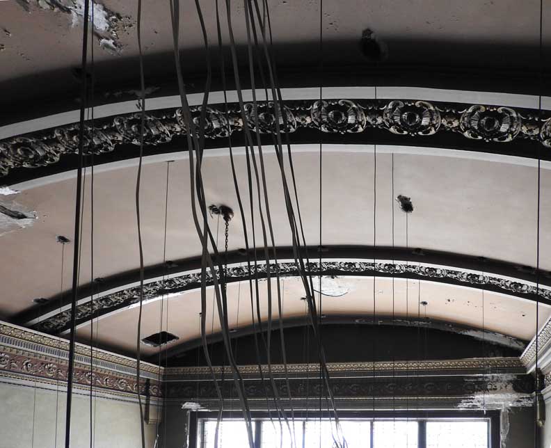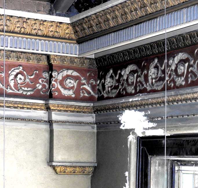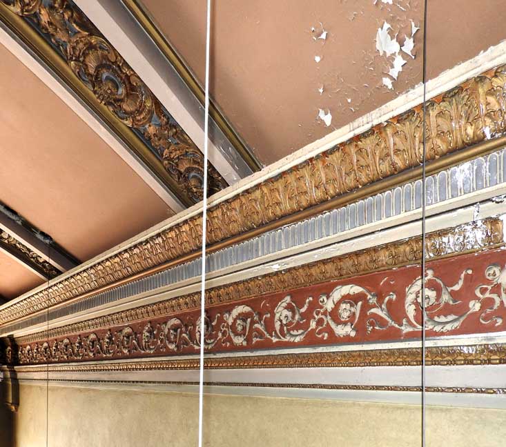 "The front façade was blocked off as well, masking large stained glass windows facing the street, which finished off the magnificent portico entrance. The center window read 'Shea’s North Park' across the face, and was flanked, appropriately, by the tragedy and comedy masks on either side. " 'Are you afraid of heights?' asked Alice Eoannou, landlord of the North Park for the last two years along with her husband, while ascending the stairs to get a glimpse of the other side of the façade. On delicate beams, in between wires holding up the newer ceiling, the stained glass windows can be seen still intact, and are amazing in size alone, even viewed in reverse." - Joseph DiDomizio, "The North Park: Uncovering Neoclassicism in a Buffalo Theatre" ![]() Original lobby ceiling still has plaster ornamentation in July of 2018 ... The wires support the dropped ceiling ![]() Left front corner. Plaster ornamentation, from the top: Acanthus leaves (gold) ... Fluting (blue) ... Leaf-and-dart (gold) ... Scrolling acanthus leaves (red background) ... Leaf-and-dart (gold) ... Two rows of bead-and-reel molding. Damaged plaster ![]() Right front corner ... Note ceiling ornamentation which is detailed below: ![]() From a different angle: ![]() C scrolls are on the ceiling (detailed below:) ![]() C scrolls ![]() Acanthus leaves (gold) ... Fluting (blue) ![]() Acanthus leaves (gold) ... Scrolling acanthus leaves (red background) ... Leaf-and-dart (gold) ... Bead-and-reel molding ![]() Top of the ticket lobby dome ... Sunlight washes out the stained glass windows which are shown below: ![]() ![]() At front of the original lobby is the stained glass window (note "Shea's") which was plastered over in 1948 when the name was changed to Loew's North Park Theatre, but uncovered in 2014 when Thomas Eoannou bought the theatre ![]() Greek comedy mask ![]() ![]() ![]() ![]() ![]() Greek tragedy mask ![]() Back of the original lobby ceiling and wall ... Note damaged plaster under the opening at left ... Wall details below: ![]() Far left: Damaged reinforced plaster ![]() Center: Plaster balustrade (detailed below:) ![]() Center: Acanthus panel decoration on left support ... Double vase balusters ![]() Right: Damaged reinforced plaster ![]() False dropped ceiling dome |
