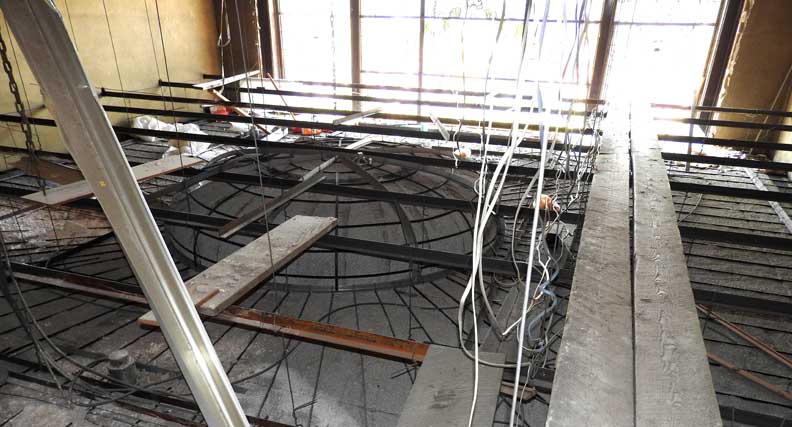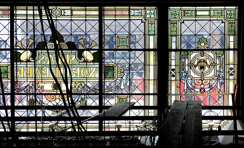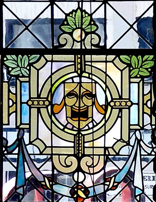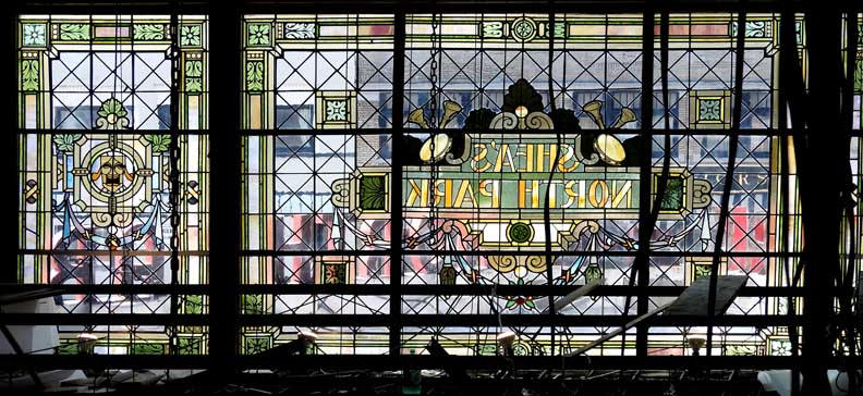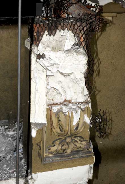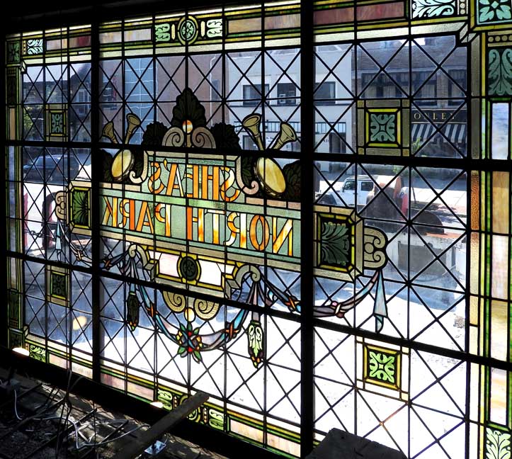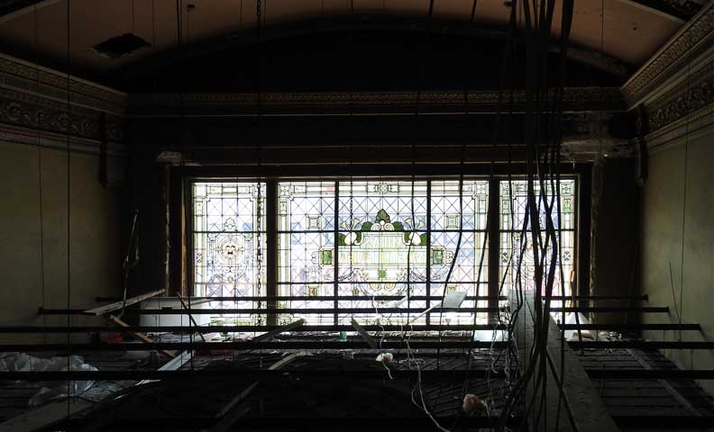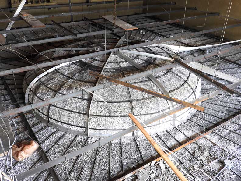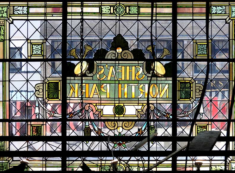 "The front façade was blocked off as well, masking large stained glass windows facing the street, which finished off the magnificent portico entrance. The center window read 'Shea’s North Park' across the face, and was flanked, appropriately, by the tragedy and comedy masks on either side. " 'Are you afraid of heights?' asked Alice Eoannou, landlord of the North Park for the last two years along with her husband, while ascending the stairs to get a glimpse of the other side of the façade. On delicate beams, in between wires holding up the newer ceiling, the stained glass windows can be seen still intact, and are amazing in size alone, even viewed in reverse." - Joseph DiDomizio, "The North Park: Uncovering Neoclassicism in a Buffalo Theatre" ![]() Original lobby ceiling still has plaster ornamentation in July of 2018 ... The wires support the dropped ceiling ![]() Left front corner. Plaster ornamentation, from the top: Acanthus leaves (gold) ... Fluting (blue) ... Leaf-and-dart (gold) ... Scrolling acanthus leaves (red background) ... Leaf-and-dart (gold) ... Two rows of bead-and-reel molding. Damaged plaster ![]() Right front corner ... Note ceiling ornamentation which is detailed below: ![]() From a different angle: ![]() C scrolls are on the ceiling (detailed below:) ![]() C scrolls ![]() Acanthus leaves (gold) ... Fluting (blue) ![]() Acanthus leaves (gold) ... Scrolling acanthus leaves (red background) ... Leaf-and-dart (gold) ... Bead-and-reel molding ![]() Top of the ticket lobby dome ... Sunlight washes out the stained glass windows which are shown below: ![]() ![]() At front of the original lobby is the stained glass window (note "Shea's") which was plastered over in 1948 when the name was changed to Loew's North Park Theatre, but uncovered in 2014 when Thomas Eoannou bought the theatre ![]() Greek comedy mask ![]() ![]() ![]() ![]() ![]() Greek tragedy mask ![]() Back of the original lobby ceiling and wall ... Note damaged plaster under the opening at left ... Wall details below: ![]() Far left: Damaged reinforced plaster ![]() Center: Plaster balustrade (detailed below:) ![]() Center: Acanthus panel decoration on left support ... Double vase balusters ![]() Right: Damaged reinforced plaster ![]() False dropped ceiling dome |