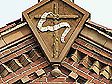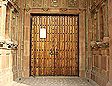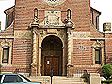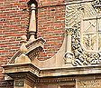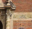Main entrance: oak doors surround by glazed terra cotta ornamentation |
