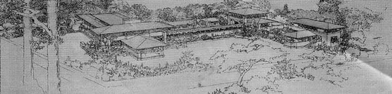 Plate XXXII(a). Dwelling of D. D. Martin, Buffalo, New York, 1904. Bird's eye view of the Martin House compkex from Ausgeführte Bauten und Enwürfe von Frank Lloyd Wright (Ernst Wasmuth, publisher, Berlin, 1910) Left: Martin House, Pergola, Conservatory, Carriage House (left of Conservatory), Barton House |