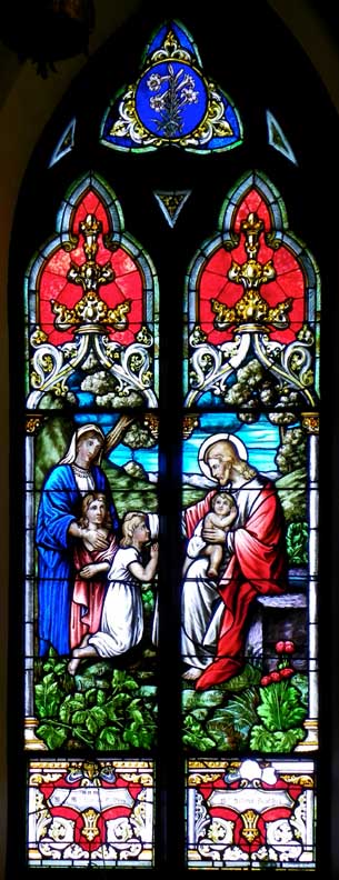 Chidren Double lancets crowned by a trefoil encasing circled lilies, a symbol of purity. Each lancet is framed by an ornate architectural canopy which grounds the figures that otherwise might appear to float in space. Perspective, architectural details and the detailed enamel work suggest the Munich Pictorial style which drew heavily on Renaissance art for inspiration. LARGER SIZE beneath top photo |
