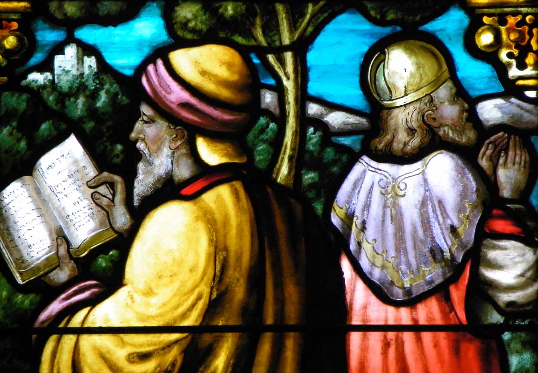 Heals a Blind Man "He [the blind man] looked up and said, 'I see people; they look like trees walking around.' " - Mark 8:24 Perspective, architectural details and the detailed enamel work suggest the Munich Pictorial style which drew heavily on Renaissance art for inspiration. LARGER SIZE beneath top photo |