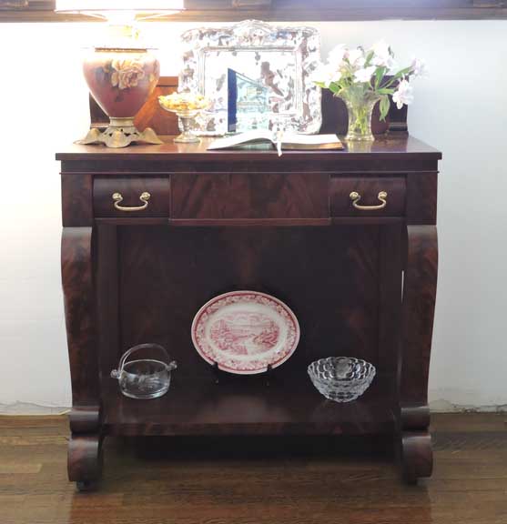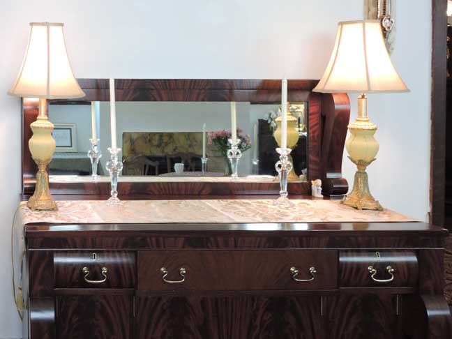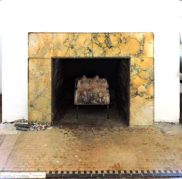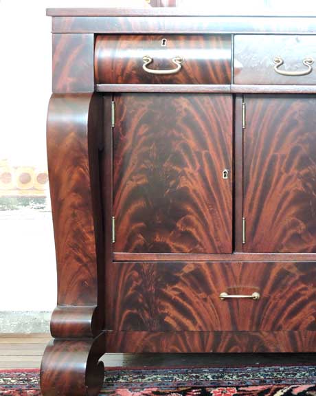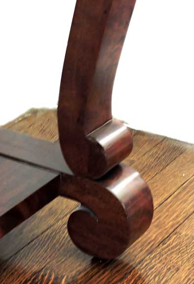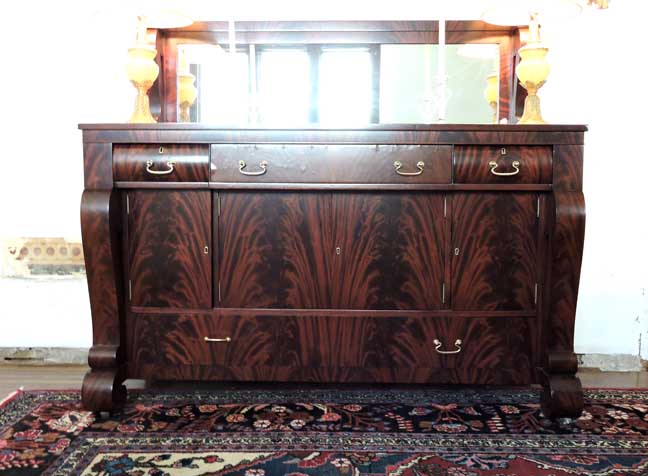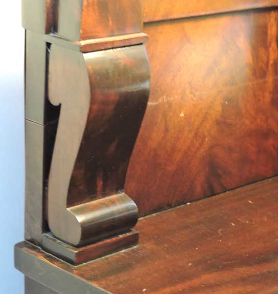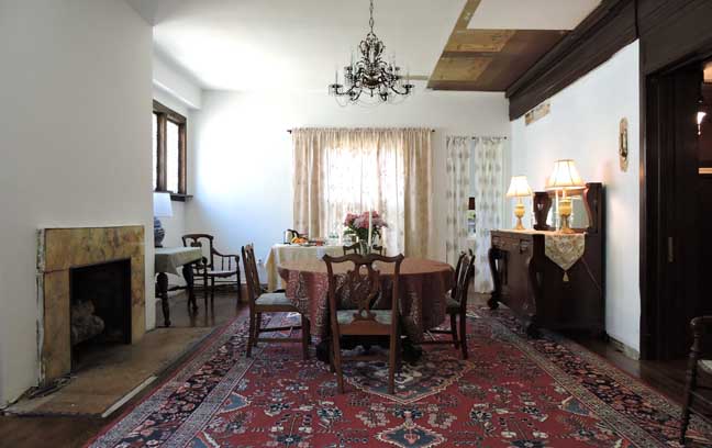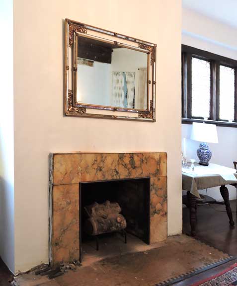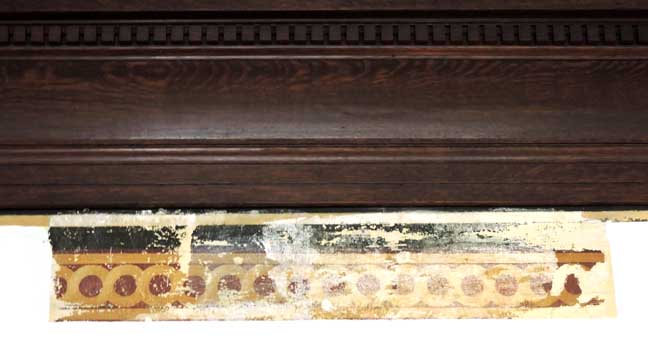 2015 photos ![]() Note revealed ceiling at right. White paint was removed by new owners in the 2014 rehabilitation. ![]() Stenciing Originally, all the ceilings and walls in the house were covered by canvas which was attached to the wet ("tender") plaster. The canvas was then painted by artists in most rooms, including the dining room. The art work was later covered with white paint, perhaps in 1943 when the house was converted into a boarding house. A small section of the ceiling and wall, as partly seen in this photograph, was uncovered in 2014 in the conversion to a B&B. ![]() Revealed wall section under crown molding features dentils ... The circular pattern was probably guilloche pattern when it was originally painted. ![]() Revealed wall section behind thermostat, one of nine identical thermostats in the house ... The pneumatic heat control thermostat manufacturer was Johnson Services of Milwaukee, WI, which patented the design in 1894 ... Circles are probably a faded guilloche pattern ![]() Leaded glass sash window ![]() Leaded glass sash window, closed ... The development of counterweighted vertically sliding sashes in the 1670s eliminated the need for for mullions and transoms while allowing much larger areas of glass to be moved. ![]() Leaded glass sash window, open ... Windows are raised into the upper wall. ![]() Mirror was a gift in May 2014 from one of the guests in the B&B ![]() Mirror detail ![]() Fireplace with original gas logs ... Brick hearth ![]() Fireplace marble detail ![]() Empire style sideboard Empire sideboards went classically architectural, with scroll or pillar supports, two end doors and two central doors. Soon a looking glass was invariably set in the back rail, often with shelves above it. Mahogany was the preferred wood, with symmetrically matched veneers glued on pine ... Two details below: ![]() Detail #1 - Empire style sideboard ![]() Detail #2 - Empire style sideboard ... Flame / Crotch mahogany ... C-scroll foot ![]() Empire style server ... Matches the sideboard illustrated above ... Both the sideboard and server, part of a dining room set (along with a dining table) are family heirlooms from Jamestown ... Two details below: ![]() Server detail #1: Console ![]() Server detail #2: Bottom of scroll or pillar support ... C-scroll foot |