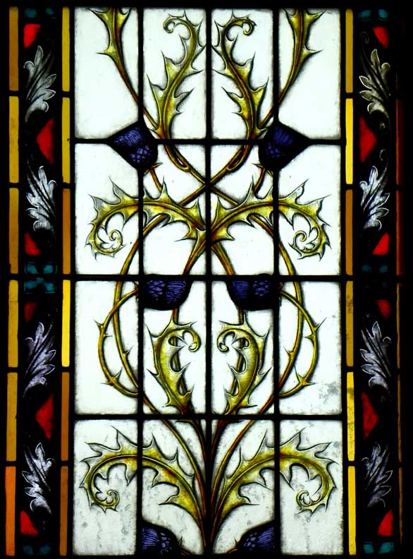 The Bishops' Window A tracery of thistle, the plant badge of Scotland, appears above and below the central figure as a reminder of the heritage of the Anglican Church of Scotland, whose Bishops consecrated the first bishop of the Episcopal Church, Samuel Seabury, after the American Revolution. The window was designed by Paul Frohe of Buffalo and executed by the Tyroler Glasswerk in Innsbruck, Austria. It was made in five sections, shipped here by air express and installed by Mr. Frohe in November of 1971. It was given in memory of John and Ada Herzog to honor of all the Bishops of Western New York by Wilberforce Herzog. The 100-year-old window it replaced was saved and cut into souvenir suncatchers for the 100th anniversary of the building of the church. LARGER SIZE beneath top photo |