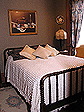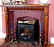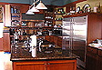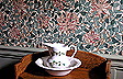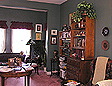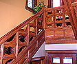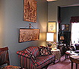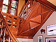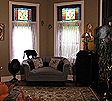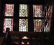 Second floor sitting area overlooks the colored glass windows on the staircase landing |