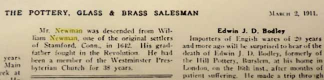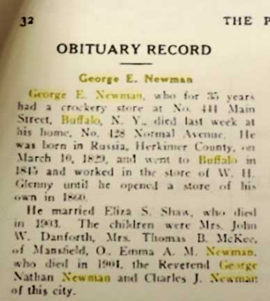 ![]() ![]() March 2, 1911 George E. Newman, who for 35 years had a crockery store at No. 441(?) Main Street, Buffalo, N.Y., died last seek at his home, No. 128(?) Normal Avenue. He was born in Russia, Herkimer County, on March 10, 1829, and went to Buffalo in 1845 and worked in the store of W. H. Glenny until he opened a store of his own in 1860. He married Eliza S. Shaw, who died in 1903. The children were Mrs. John W. Danforth, Mrs. Thomas B. McKee, of Mansfield, O., Emma A. M. Newman, who died in 1901, the Reverend George Nathan Newman and Charles J. Newman of this city. Mr. Newman was descended from William Newman, one of the original settlers of Stamford, Conn., in 1612(?) His grandfather fought in the Revolution. He had been a member of the Westminster Presbyterian Church for 38 years. - Source: The Pottery, Glass & Brass Salesman |