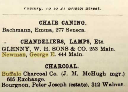 China, Glass, Crockery, Etc., No. 444 Main Street. The development of the trade in china, glass, and crockery ware, and of the most elegant fancy household goods, etc., is indicative of the increase of material wealth, refinement, and culture among the American people. A house in Buffalo whose policy and methods have always retained for it the confidence of the commercial world, and whose ability, enterprise, and energy place it in the front rank of the wholesale and retail trade in this line of goods, that of Mr. George E. Newman, centrally located at No. 444 Main Street, is well worthy of more than passing observation. Mr. Newman was born in Poland, Herkimer County, this state, and has been a resident ot this city since 1845. Having a full knowledge of this trade, he inaugurated this establishment at this address on his own account in 1860 and at once developed a very large and substantial trade, both wholesale and retail, and extending throughout the city and surrounding country. The premises utilized comprise a handsome, substantial, four-story brick building, having a frontage of 20 feet, with a depth of 125 feet, and fully equipped with every convenience for the accommodation and advantageous display of his large and valuable assortment of goods. The stock carried embraces a bewildering variety of beautiful and brilliant wares in china and glass, Sevres, Limoges, German, and French china; lava, bisque; and Parian marble; Bohemian stained glass, cut and embossed; also plain and pressed glass ware, statuary, fancy and ornamental wares for use and ornament; also lamps in every variety, from the piano telescope to the smallest size, and of all patterns, together with their fittings; yellow and stone ware. Rockingham, Wedgewood and Trenton pottery, etc. He also carries a full line of household cutlery, fancy wares of all kinds, plated goods, etc. His long experience in the business, together with bis superior connections, enable him to place before his patrons the very best lines of goods and at the very lowest prices. Mr. Newman is a popular, polite, and courteous gentleman, ot high executive ability, energetic and rehable, and is most highly respected as a merchant and public spirited citizen. - Source: George Milroy Bailey, Illustrated Buffalo: The Queen City of the Lakes, p. 112 (1890) (online Feb. 2015)