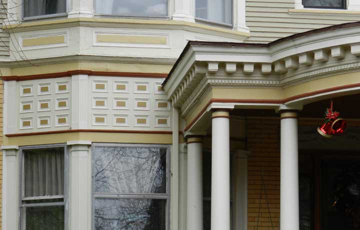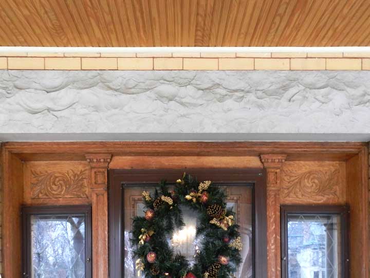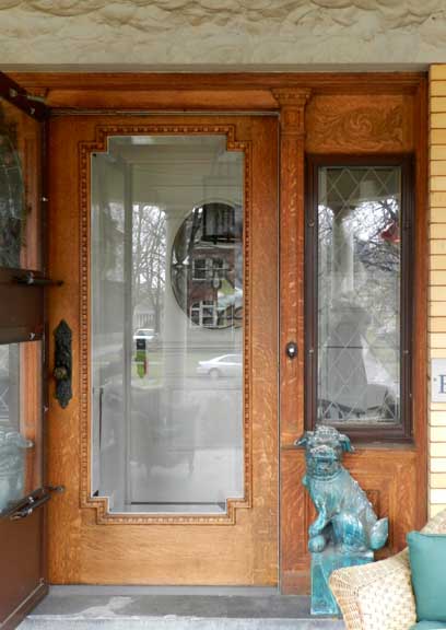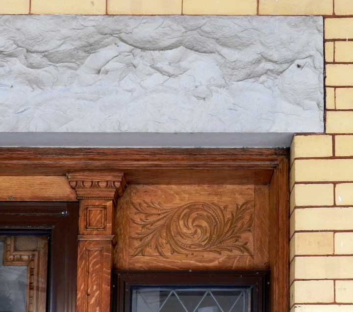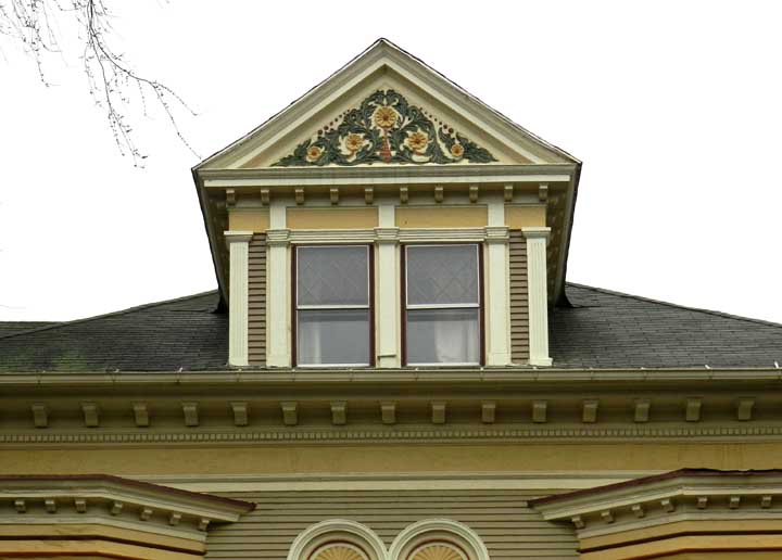 2011 photos![]() Colonial Revival Photos taken November 2011 ![]() ![]() Note carriage house in rear (photo at bottom of the page) ![]() Dormer: Plaster(?), foliated tympanum ...... Modillions supporting triangular pediment ..... Tuscan pilasters. ![]() Colonial Revival spandrel panels feature sunken rectangular rectangles (cf., coffered ceilings) ![]() Note massive stone lintel (in photo below, also) ![]() Massive stone lintel ... Applied, carved foliated panels above side lights ..... Paired pilasters ![]() Pilaster features egg-and-dart capital molding ![]() Egg-and-dart molding glass surround ![]() |