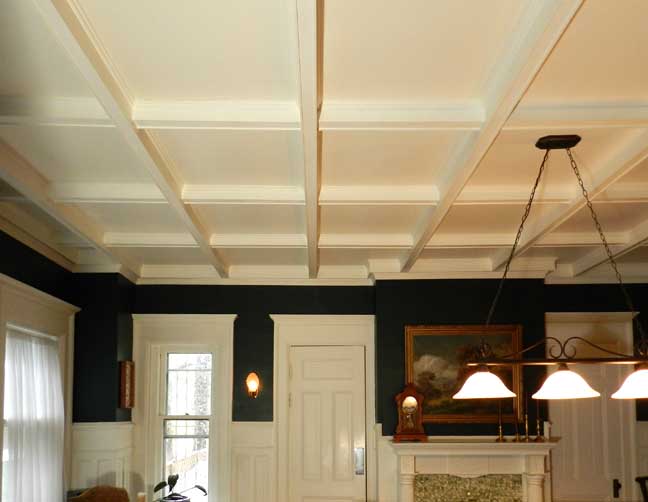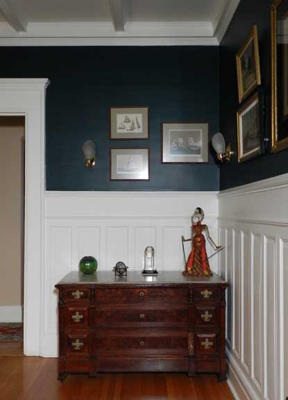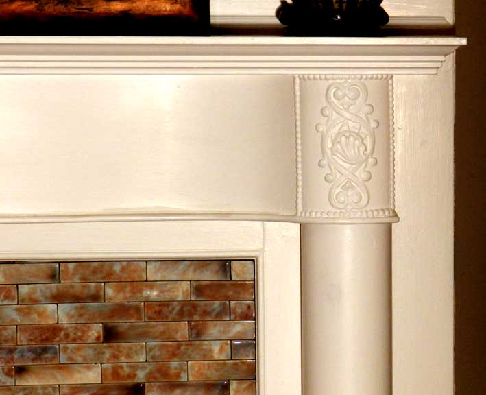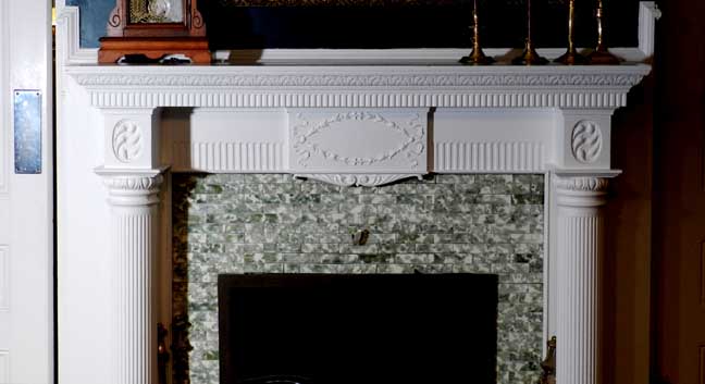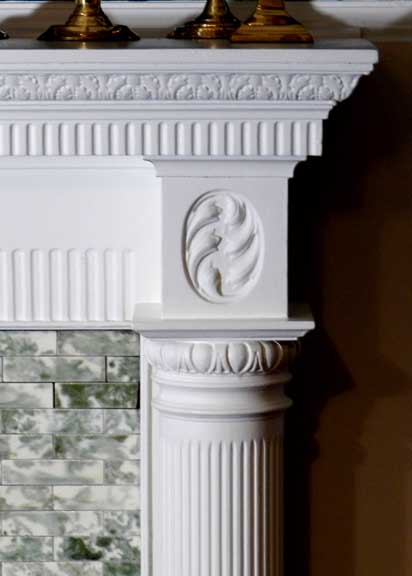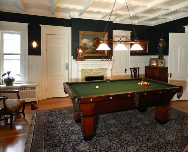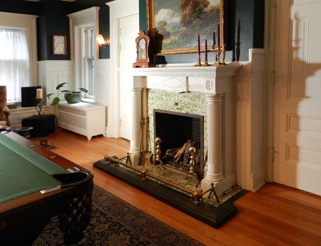 Billiards room![]() ![]() Billiards room features box beam ceiling. ![]() Billiards room wall and door cornices. ![]() Billiards room Colonial Revival fireplace. ![]() Billiards room ![]() Billiards room fireplace. Center panel features bellflowers and ribbons. ![]() Billiards room fireplace. Cornice features leaf-and-dart and gougework. Frieze features gougework. Engaged column features egg-and-dart, Tuscan molding and fluted shaft. ![]() Billiards room Typical Colonial Revival wainscoting is painted white. |