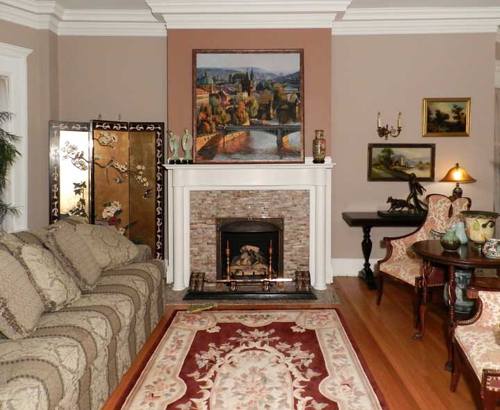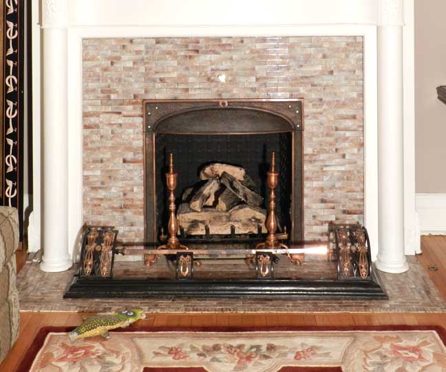 Living room![]() Living room ![]() Living room fireplace frieze and colored, glazed brick slip ![]() Living room Colonial Revival fireplace andirons and fender (Toy on carpet) |