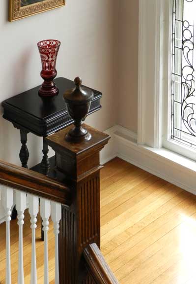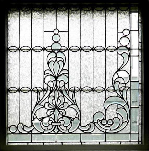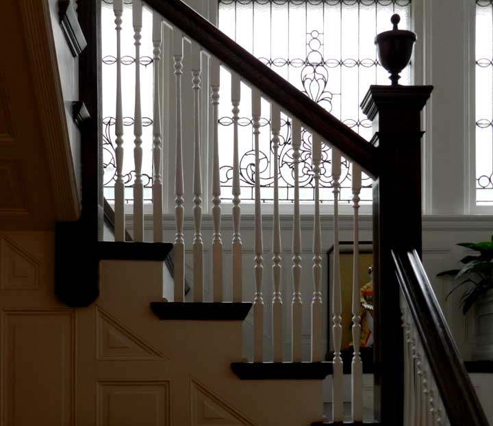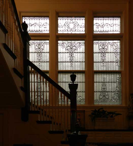 ![]() Note ceiling bracket above staircase at right (next photo below) ![]() Ancone ![]() Wainscoting ![]() Colonial Revival staircase features urn atop newel post ![]() ![]() Newel post features egg-and-dart and gougework ![]() ![]() ![]() Leaded glass window - 1 of 3 identical top panels. Clear pieces are beveled ..... Note ripple glass ![]() Leaded glass window - 1 of 3 identical middle panels. ![]() Leaded glass window - 1 of 3 identical bottom panels. ![]() ![]() Second floor |