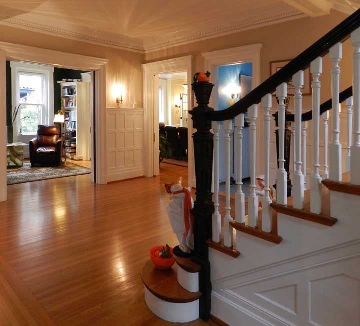 ![]() Foyer Home decorated for Halloween (note pumpkin) ![]() ![]() ![]() Lead came tracery ![]() Colonial Revival paneled wainscoting |