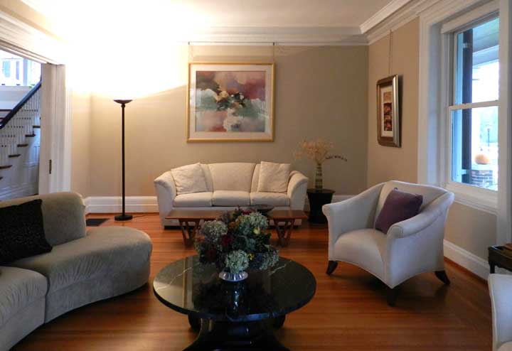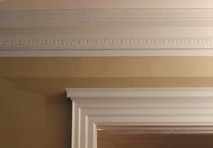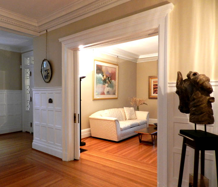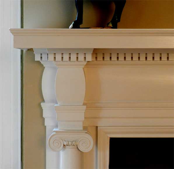 ![]() ![]() ![]() Colonial Revival fireplace ![]() From the top: Mantle ..... Dentil molding ..... Ionic capital ..... Roman smooth (not fluted) column shaft ![]() ![]() Colonial Revival paneled pocket doors ![]() Leaf-and-dart molding |