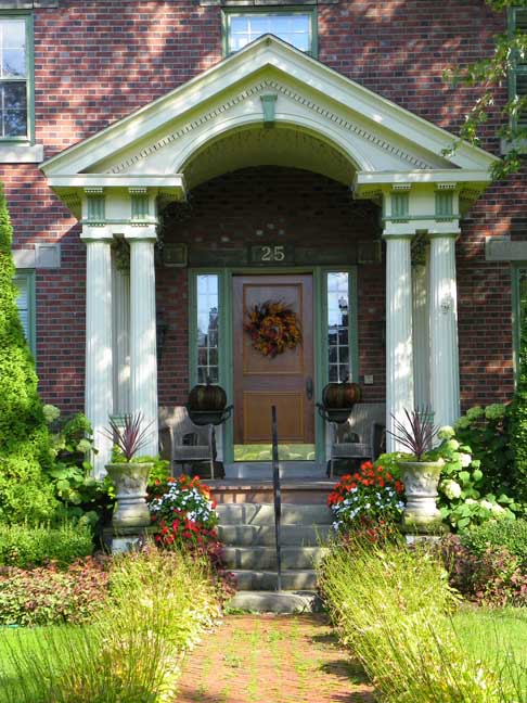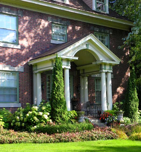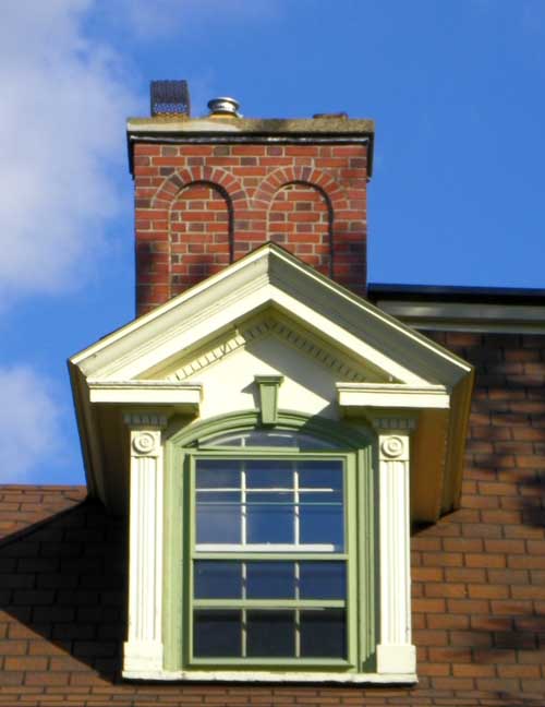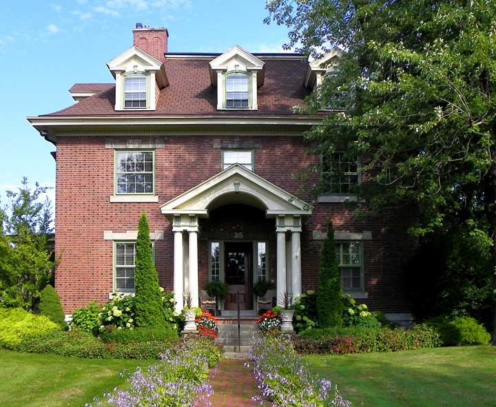![]() Colonial (Georgian) Revival ![]() Broken pedimented dormers ..... Stone lintels and sills ..... 8 over 8 first story lights ![]() Portico with Broken pediment ![]() Broken pediment ..... Dentils ..... Keystone ..... Paneled pilasters ![]() Stone lintels and sills ..... Mutules ..... Triglyphs ..... Drops ![]() Portico with Broken pediment ..... Mutules ..... Triglyphs ..... Drops ..... Fluted column shafts ![]() ![]() Portico with Broken pediment ..... Mutules ..... Triglyphs ..... Drops ..... Fluted column shafts ![]() Flemish bond |