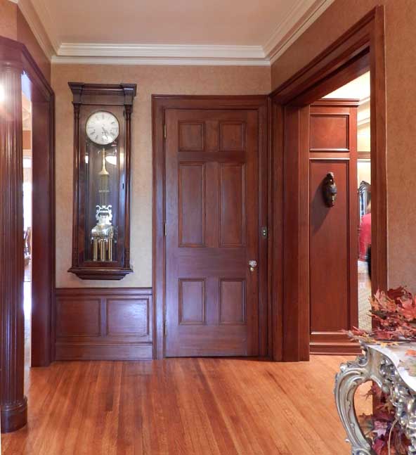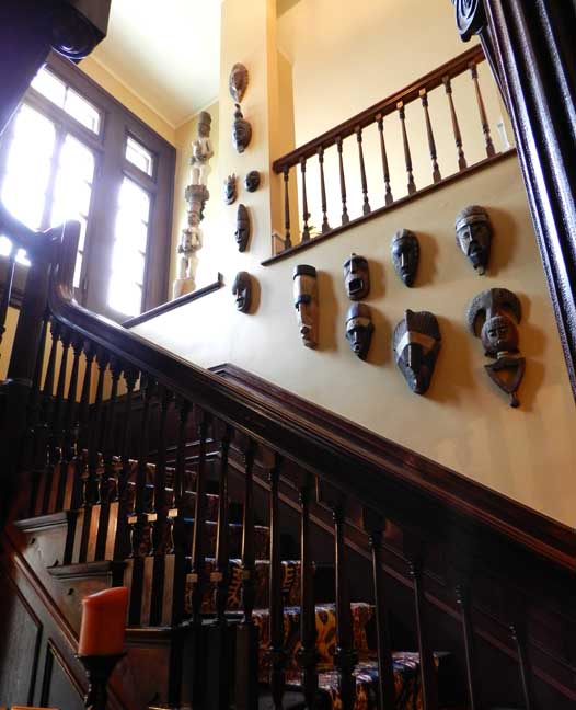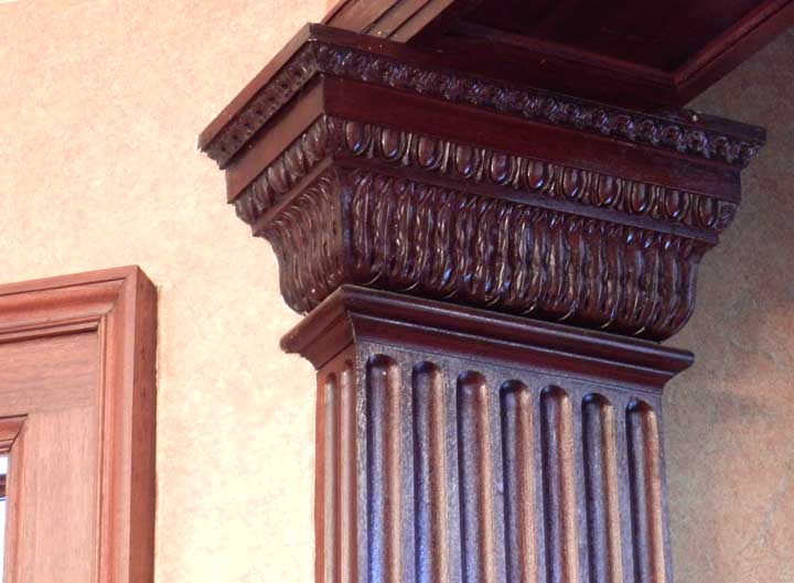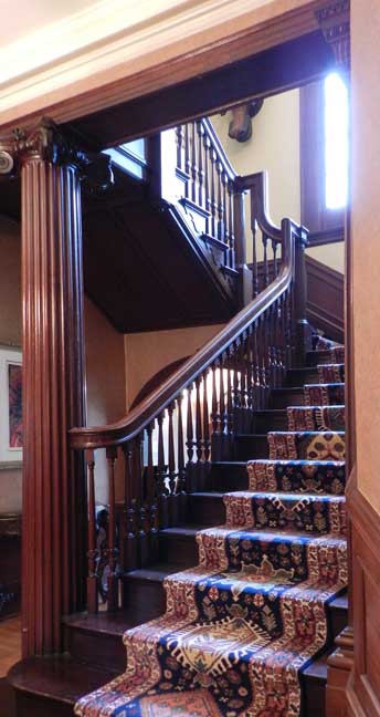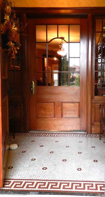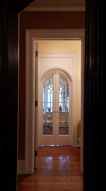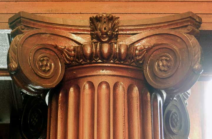 ![]() Vestibule/entry hall mosaic floor with Greek key border; paneled door (see photo below) ![]() ![]() ![]() Ionic column ![]() Thin, turned Colonial (Georgian) Revival balusters ![]() Ionic capital ![]() Pilaster: Leaf-and-dart (top) ... Egg-and-dart ... Acanthus leaves ... Fluting ![]() ![]() Thin, turned Colonial (Georgian) Revival balusters ...... Stair-ends ![]() African masks are found throughout the house ![]() Gilded Rococo Revival pier table and mirror ![]() ![]() Half bath (off the entry hall) beveled glass door |