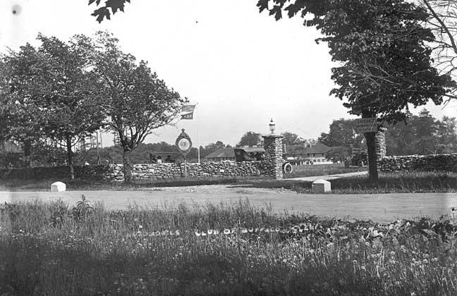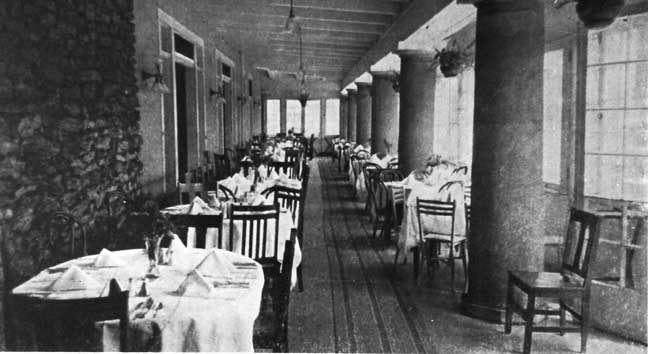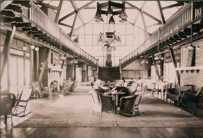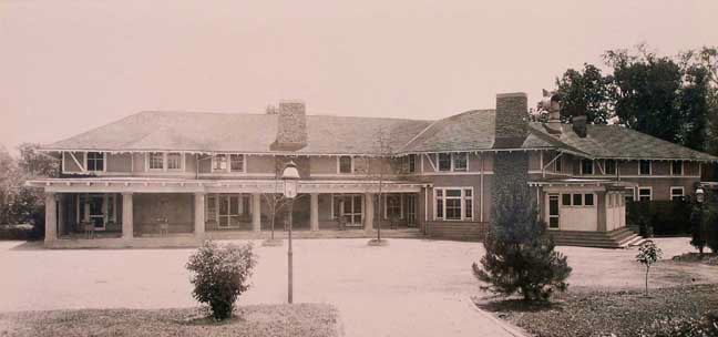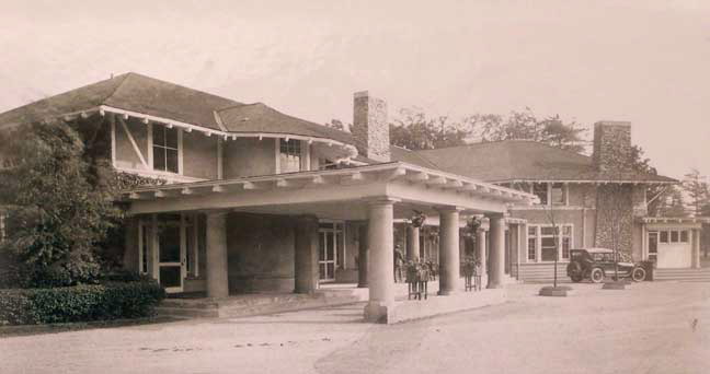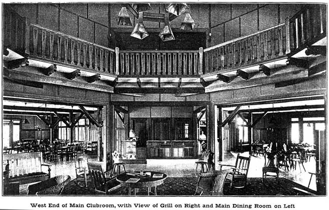 "The delightful symplicity [sic] of the Old Mission architecture has been maintained in the planning of the building, a spacious., rambling bungalow. The first impression that the motorist receives as he turns into the grounds is of the broad eaves, roomy verandas with their easy wicker chairs, inviting nooks and restful corners, all soliciting investigation. The soft gray stucco walls against the dark-green of the trees are in such perfect harmony with the environment as to seem a part of it." -- The Buffalo Motorist, April 1911