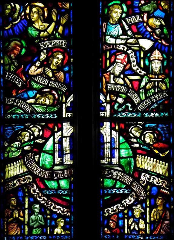 "One of the panes in the beautiful stained glass windows at the Holy Trinity Lutheran Church in Buffalo has Kaj Munk's name, together with the martyrs Jan Huss, Girolamo Savonarola, and Saint Stephen. The windows were given to the church, and dedicated on September 12, 1948. So it was an early recognition of Kaj Munk here in America." - Brian Young, Port Townsend, WA (July 2011) LARGER size beneath top photo |