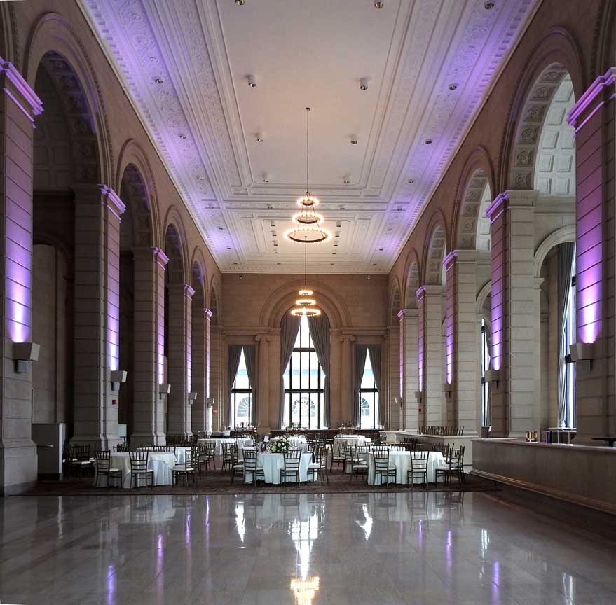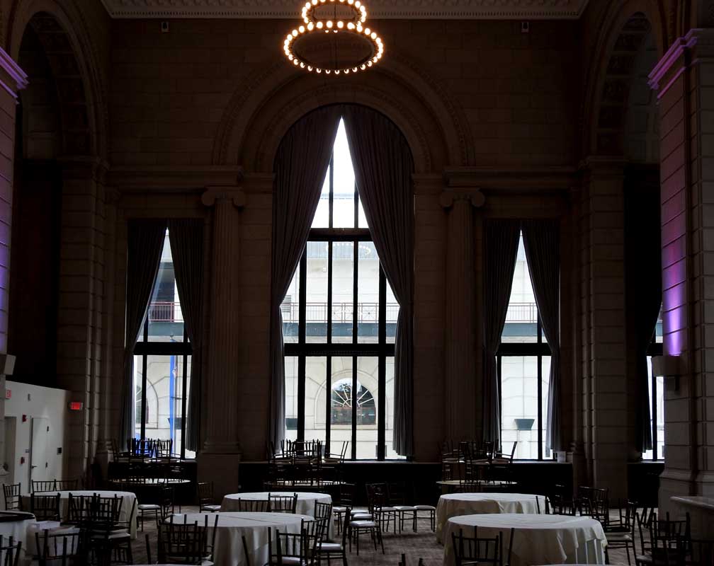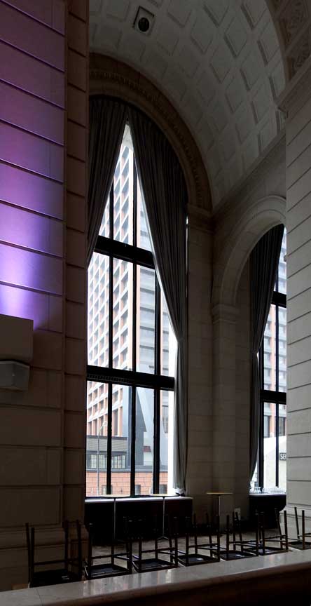 Admiral Room An apt name, given the history of the bank that was originally named Marine Bank - so named because much of its early business depended on the economic vitality of the city's lakefronts and riverfronts. "The Marin" is also connected to "marine." ![]() The original banking floor Paneled reinforced plaster ceiling Marble floor and marble-clad square Tuscan columns ![]() ![]() Roman ceiling motifs, including dentils at the bottom Balconette features double-vase balusters and acanthus leaf-decorated paired corbels ![]() Roman inspired coffered barrel ceilings, detailed below: ![]() Coffers decorated with Egg-and-dart borders ![]() Seneca One neighbor, seen through the windows, was originally named Marine Midland Center Building and was built in 196-72 to replace an expanding bank business housed in this building ![]() Seneca One seen through the windows ![]() Rosettes decorate the first row of coffers |