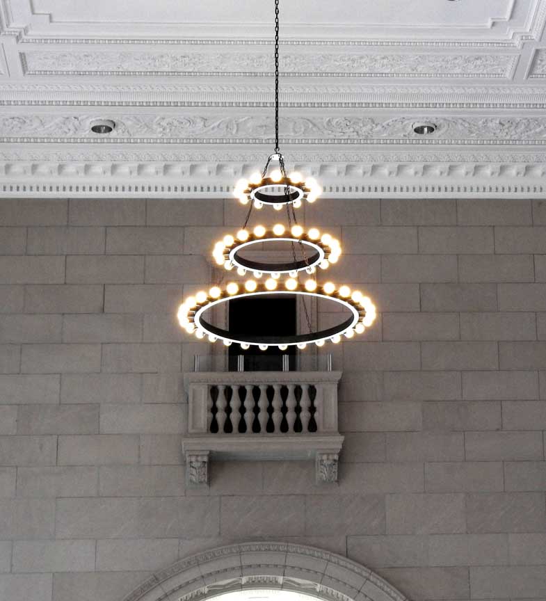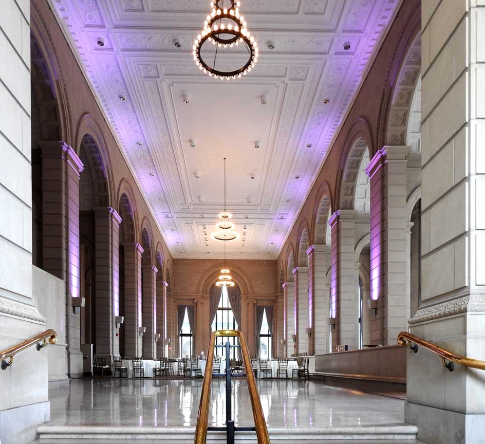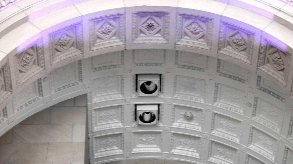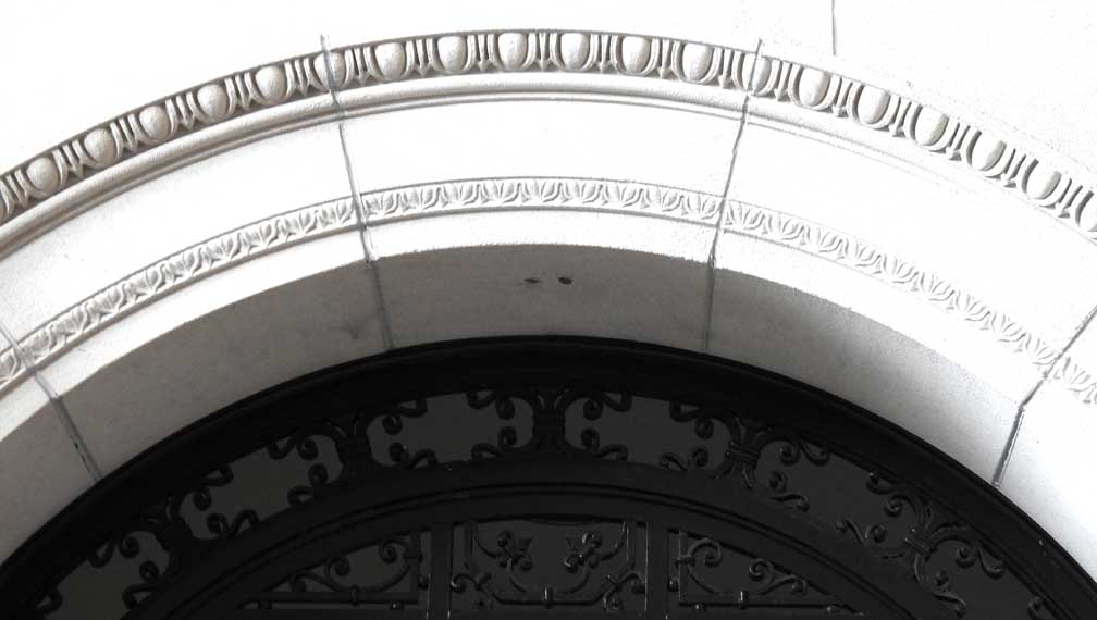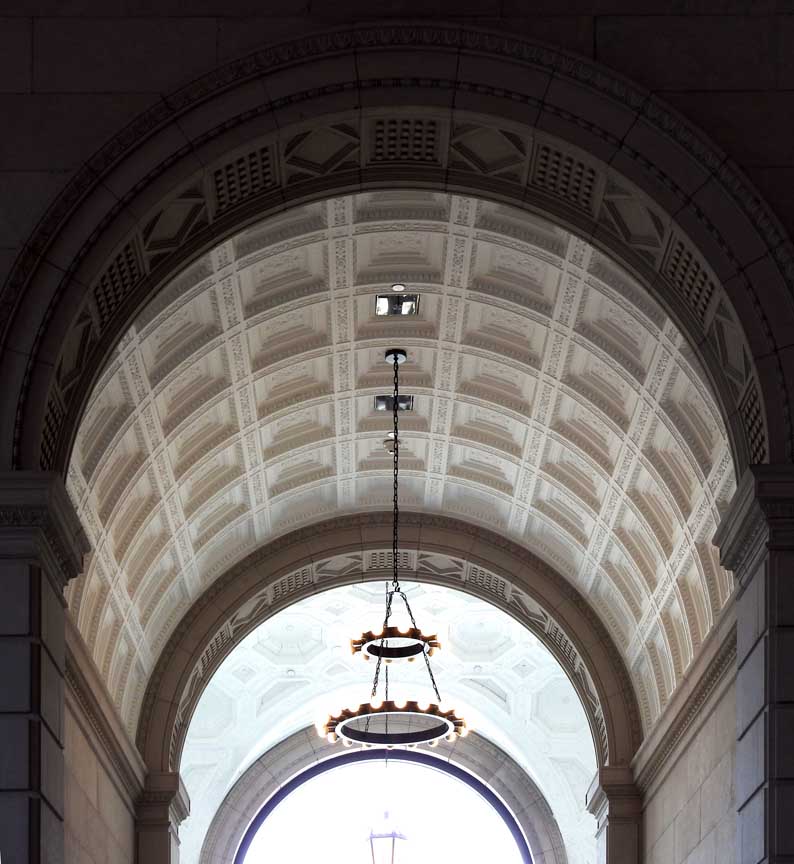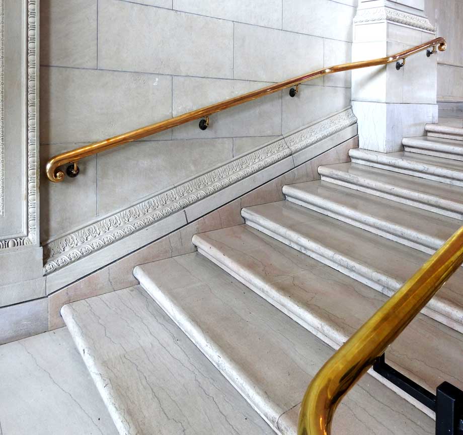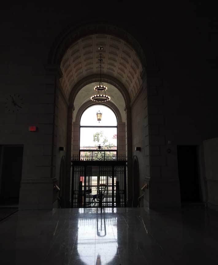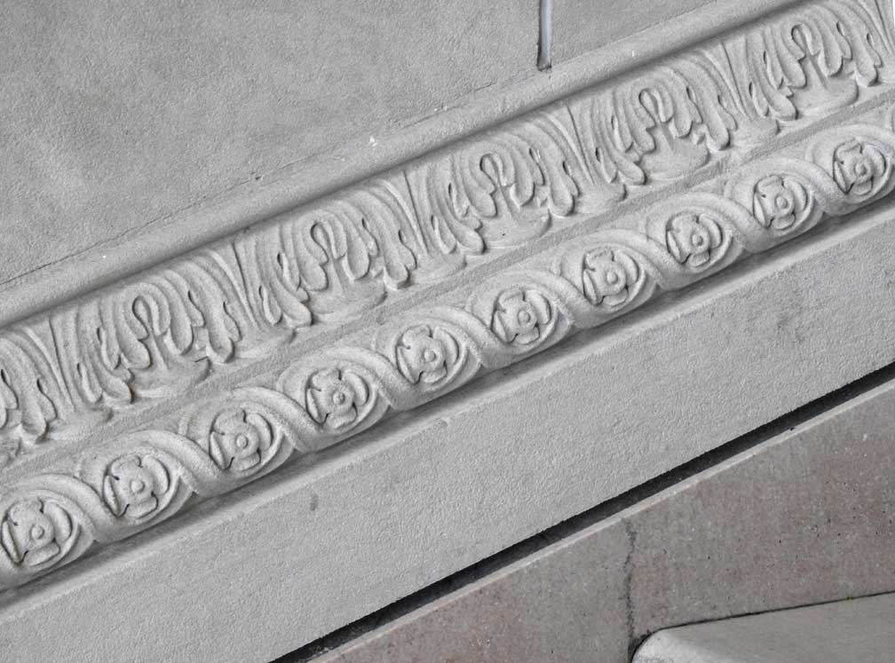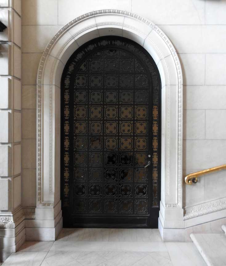 Vestibule![]() Vestibule Looking out to Main Street ![]() Plastered, coffered barrel ceilings ![]() Three door details below: ![]() Egg-and-dart molding Leaf-and-dart molding ![]() C scrolls Fleurs-de-lis ![]() Marble stairway Detail below: ![]() Indiana limestone Leaf-and-dart molding Decorated guilloche molding |