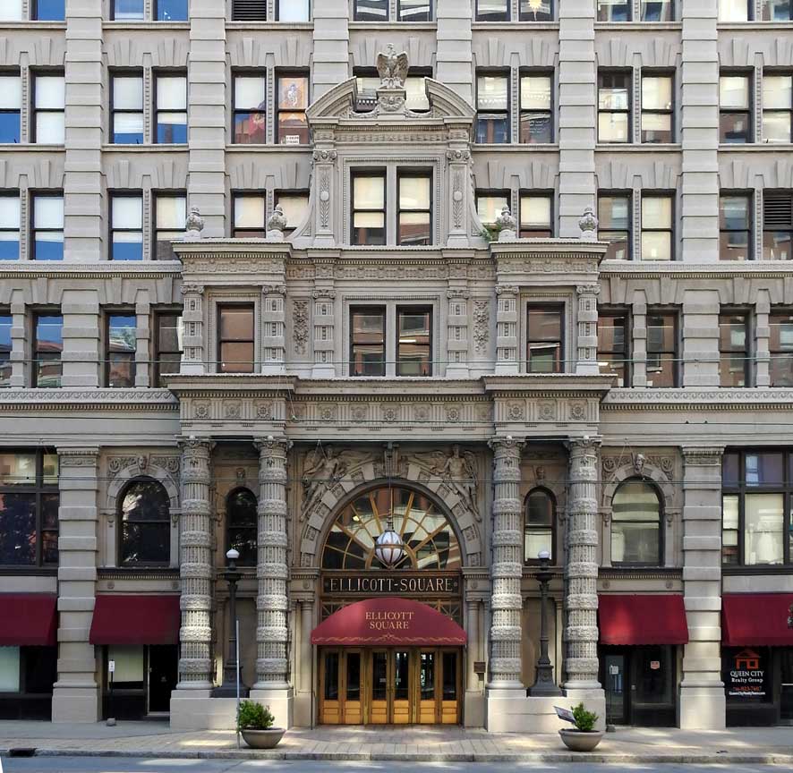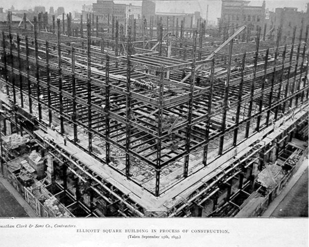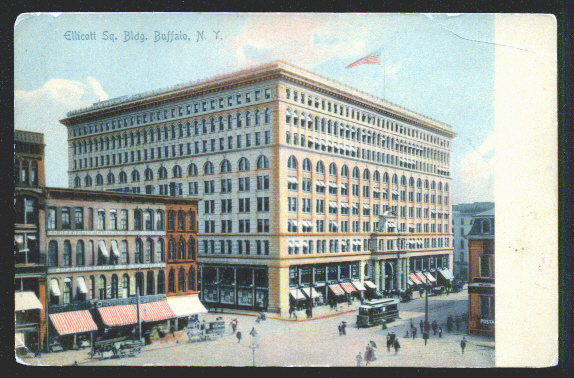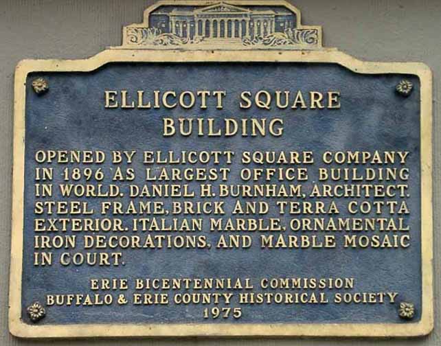 Buffalo. Like Burnham and Root's Rookery in Chicago, it is constructed around a large interior court. The elaborate terra-cotta exterior, now painted gray, which in its essential lines follows Richardson's Marshall Field Wholesale Store in Chicago, was conceived by Charles B. Atwood (1849 - 1895), the designer-in-chief of the World's Columbian Exposition and master of "all artistic matters" in the Chicago-based firm of D. H. Burnham and Company. The architecture of Ellicott Square may be termed "Italian Renaissance," with refined and classic ornamental features. To the top of the second story, the outer walls consist of granite, iron, and terra-cotta , with a veneer of pearl-gray brick and terra cotta trimmings above -- the whole being adequately crowned with a cornice of massive proportions and great beauty (removed in the 1970s). The effect was to reproduce the quiet dignity, repose, and impressive grandeur of the great palaces of Rome and Florence. Sources: