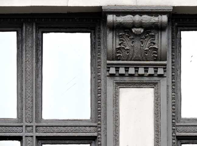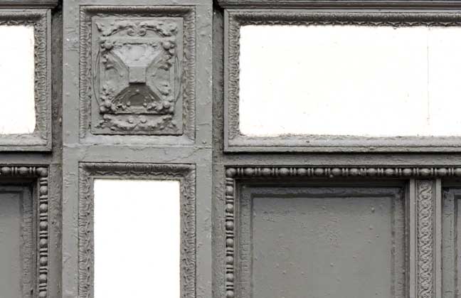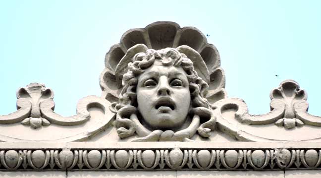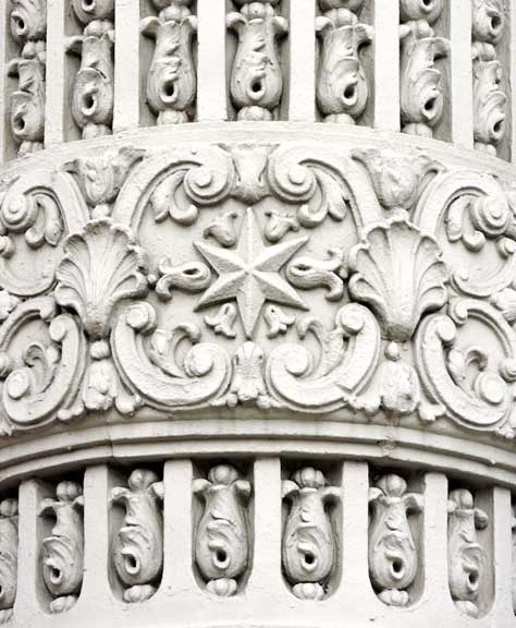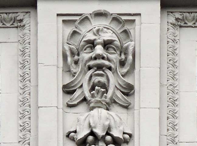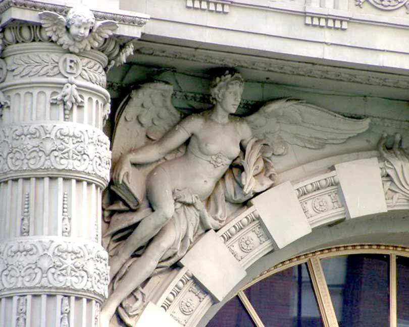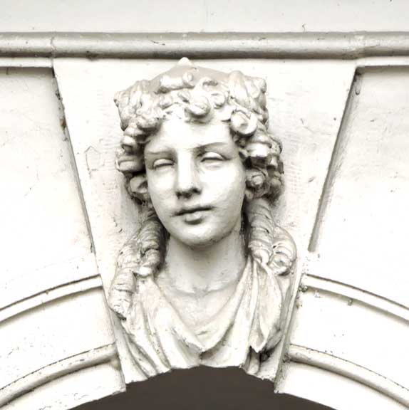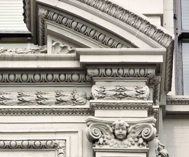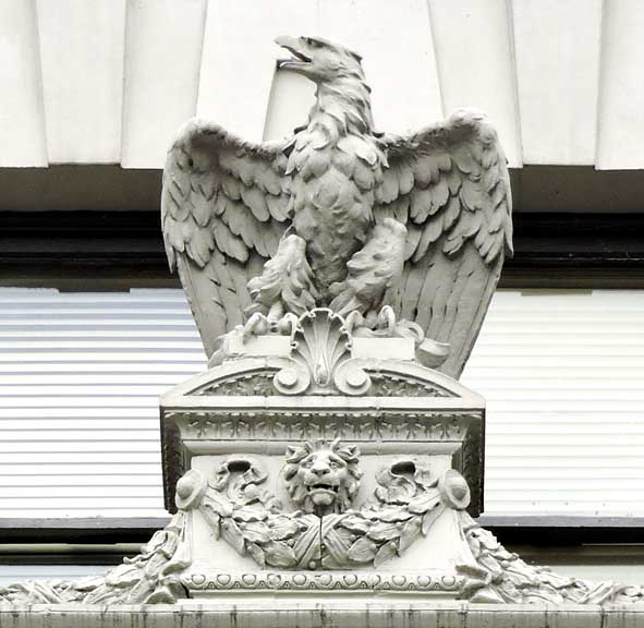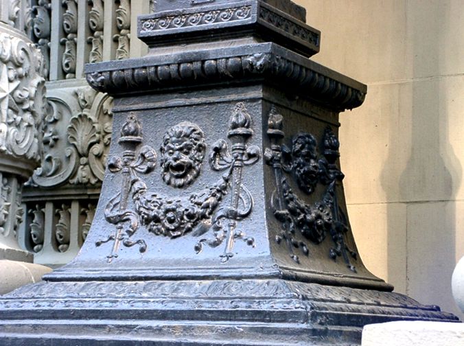 Entrance Surround![]() Entrance surround ... Terra cotta ornamentation painted gray in the 1970s ... Details below, from the top: ![]() Entrance surround ... American eagle is a finial in a broken pediment ... Flanking pilasters with putto capital ... Two details below: ![]() Entrance surround ... Detail #1 - Terra cotta ornamentation: Eagle ... Anthemion ... Lion head ... Laurel leaf garland ![]() Entrance surround ... Detail #2 - Acanthus leaves (top) ... Egg-and-dart ... Laurel leaves ... Leaf-and-dart ... Volutes ... Putto ![]() ![]() Entrance surround ... Banded columns ... Details below: ![]() Entrance surround ... Frieze: Paterae ... Triglyphs and drops ![]() Entrance surround ... Leaf-and-dart ... Putti and egg-and-dart ... Laurel leaves ... Flutes ![]() Entrance surround ... Banded column: C scrolls ... Bellflowers ![]() Entrance surround ... Classical figure keystone ![]() Entrance surround ... Classical figure keystone ![]() Entrance surround ... Classical figure keystone ... Flutes ![]() Entrance surround ... Banded columns ... Cast iron lamppost ![]() Entrance surround ... Cast iron lamppost: Torches ... Grotesque ... Ribbons ... Festoon ![]() Entrance surround ... Nike ... "Nike alone was winged. She also appears carrying a palm branch, wreath, or Hermes staff as the messenger of victory."- Encyclopaedia Britannica (online March 2018) ![]() Entrance surround ... Anthemia on globe ... Guilloche on fanlight ![]() Entrance surround ... Hermes / Mercury ![]() Entrance surround ... Bead-and-reel |